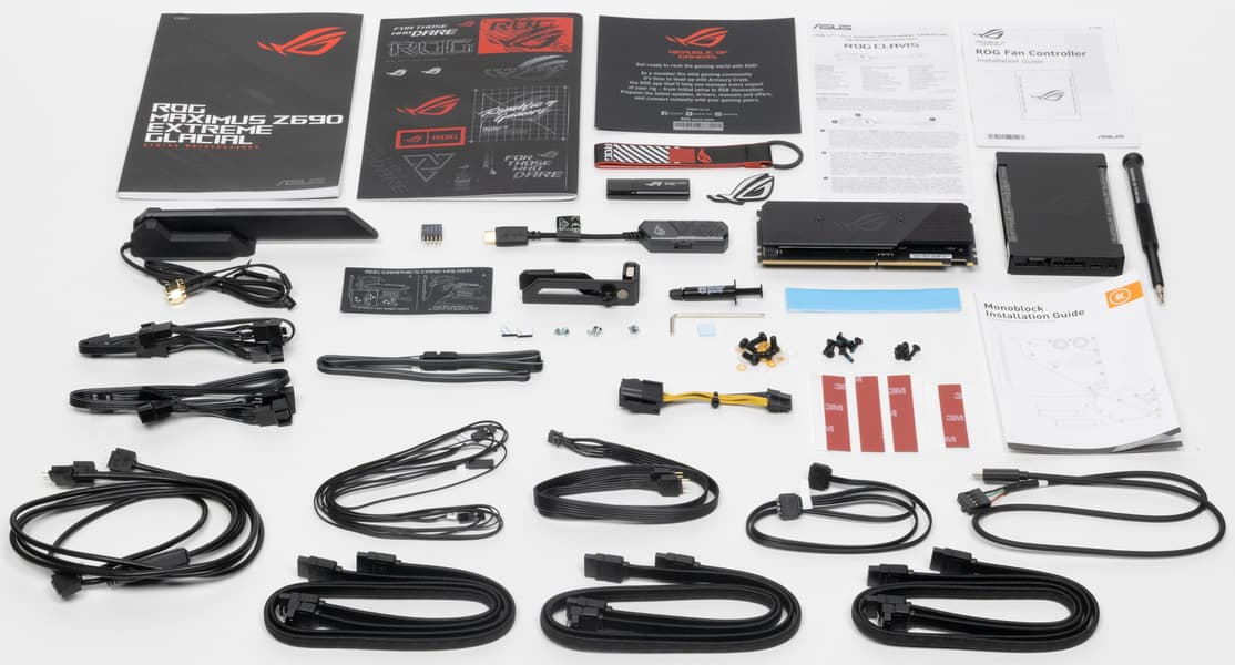 Обязательно стоит упомянуть и бонус поставки: универсальную раздвижную подставку под тяжелые видеокарты, ROG Clavis, DIMM.2, Fan Controller, брелок и т. д.