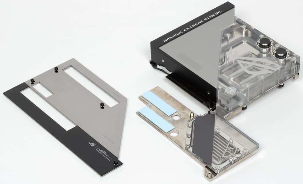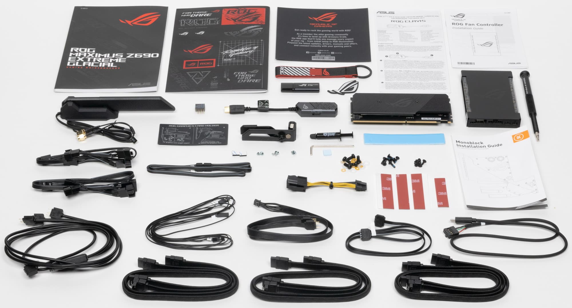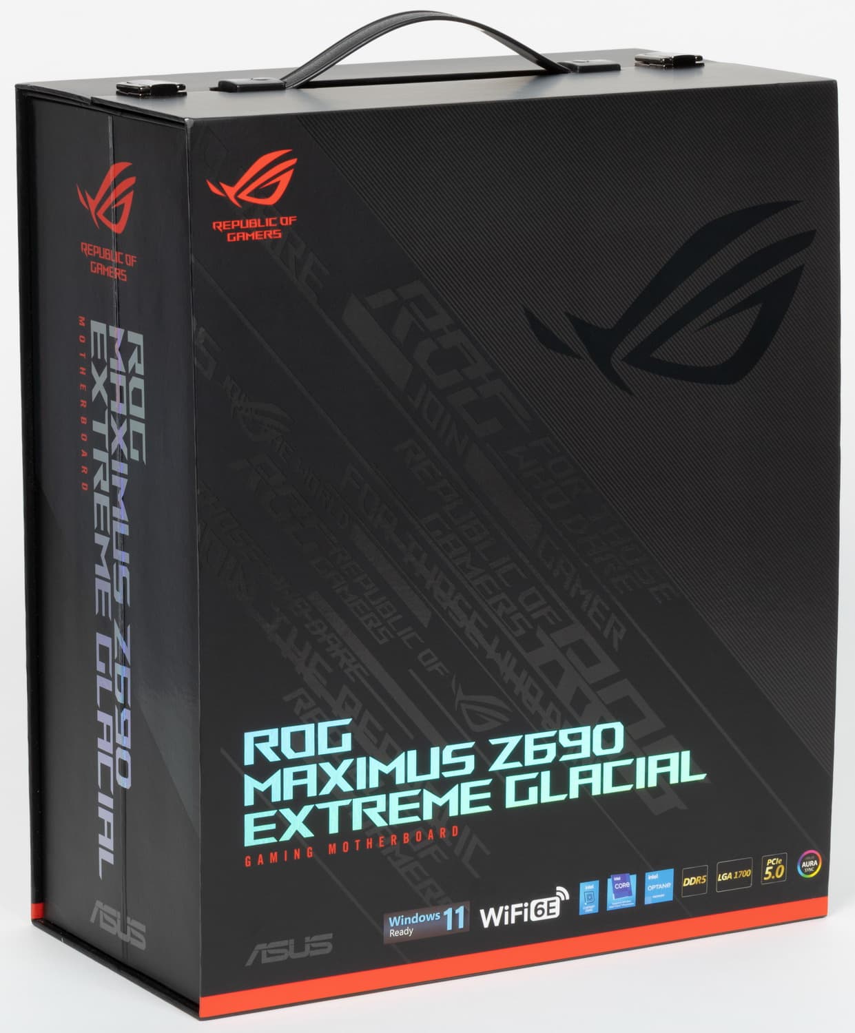 Asus ROG Maximus Z690 Extreme Glacial поставляется в огромном кейсе, который имеет ручку для переноски и раскладывается пополам. В одной половине — сама матплата, тщательно уложенная в толстый слой мягкого материала, во второй — водоблок в своем отсеке, ну и остальной комплект. .