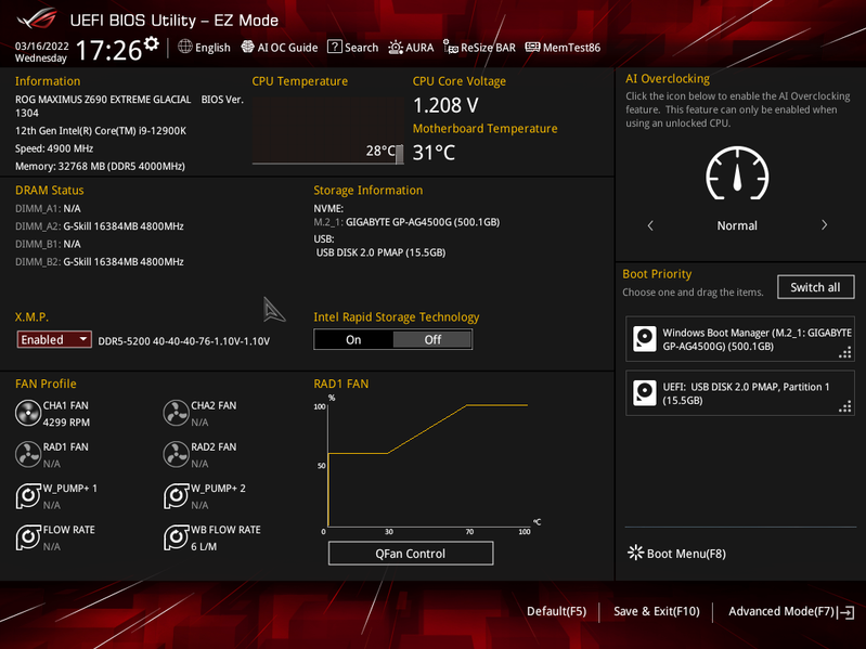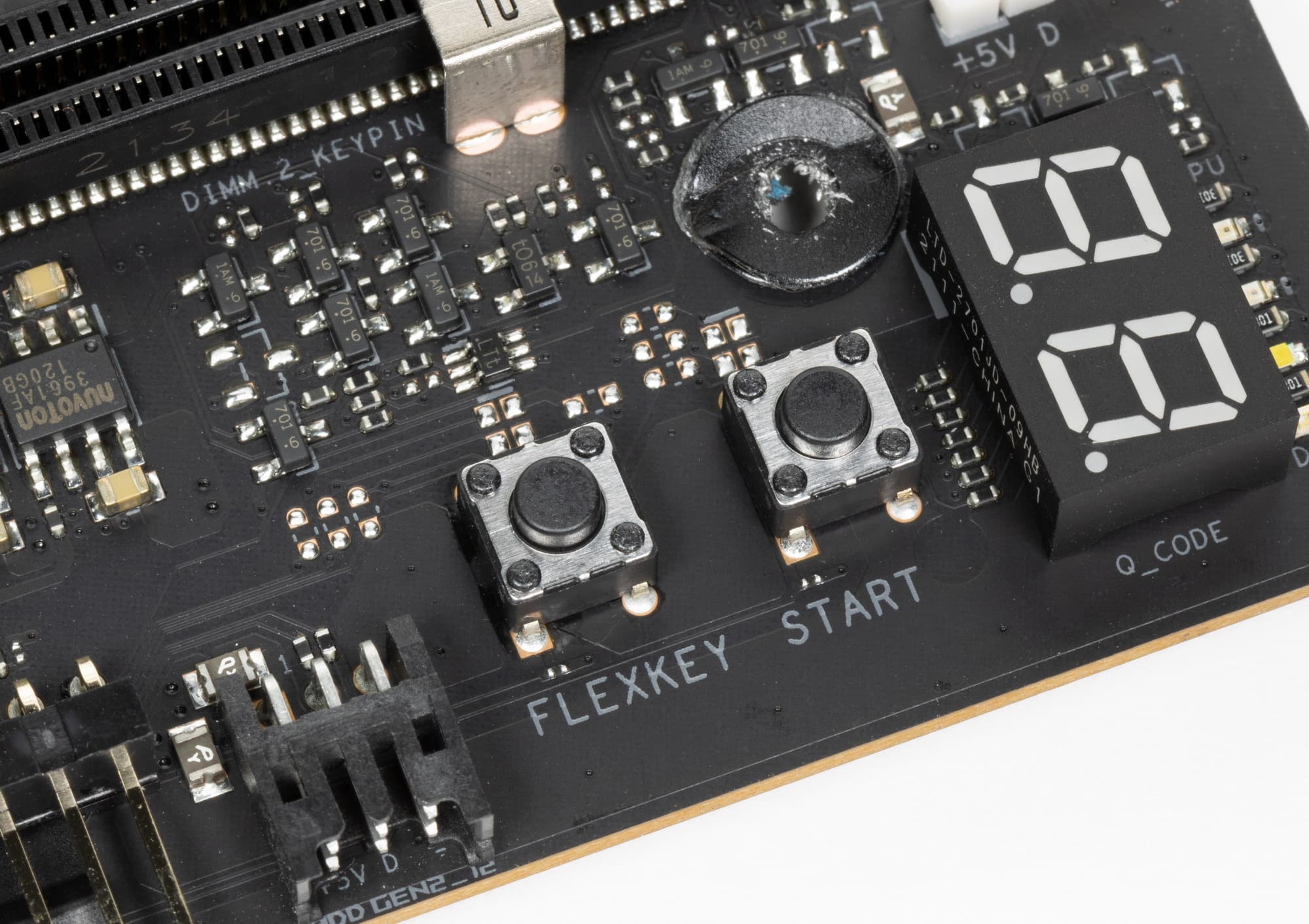 В списке поддержки периферии также есть 6 портов SATA и 6 разъемов для вентиляторов. Система питания процессора крайне мощная, способная обеспечить работу любых совместимых процессоров с запасом на разгон. Плата имеет высокоэффективную систему охлаждения каждого потенциально греющегося элемента, включая накопители в слотах M.2 (термопрокладки для охлаждения накопителей есть с обеих сторон). Сетевые возможности включают два быстрых проводных контроллера 2,5 и 10 Гбит/с и один самый современный беспроводной. Поддержка Thunderbolt 4 позволяет передавать данные на скорости 40 Гбит/с. В числе плюсов платы можно упомянуть очень красивую подсветку, включая также широкие возможности для подключения дополнительных RGB-устройств. Отметим улучшенный аудиокодек Realtek ALC4082 и прилагаемый в комплекте ROG Clavis — игровой ЦАП с выходом на миниджек, подключаемый к порту USB Type-C.