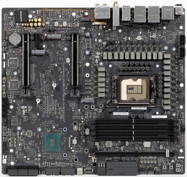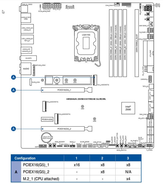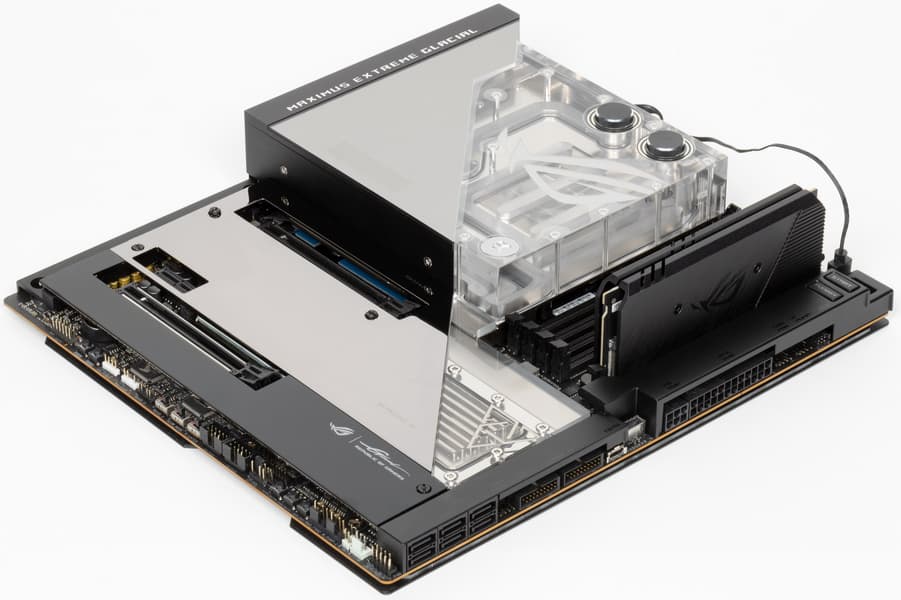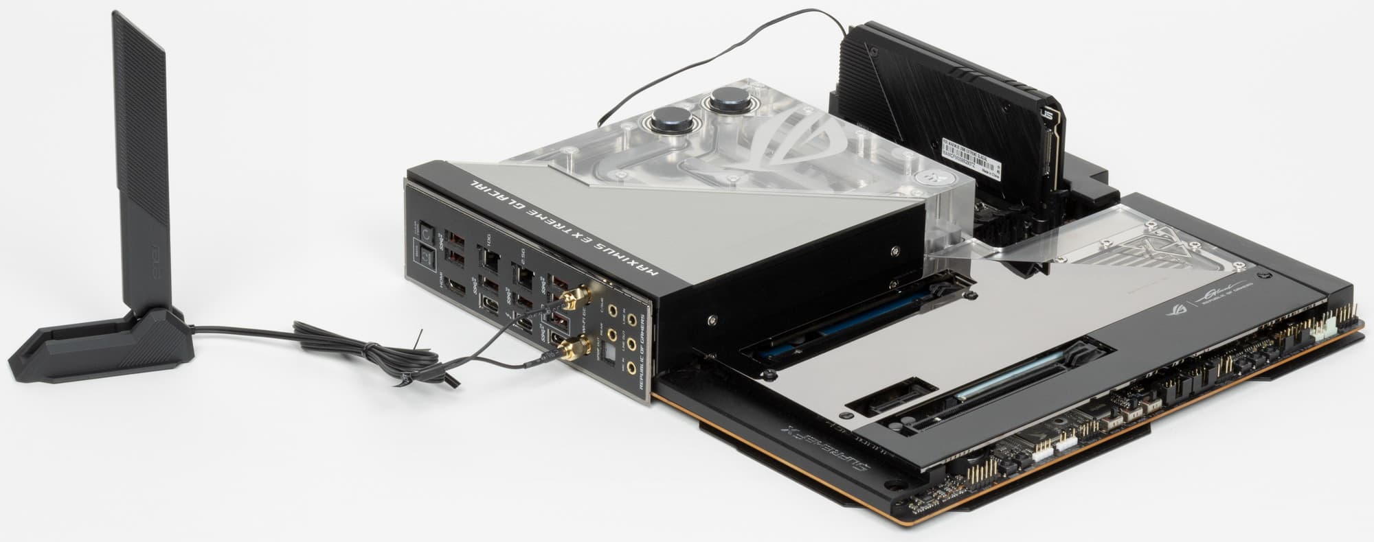 У Asus ROG Maximus Z690 Extreme Glacial 20 портов USB разных видов, включая 10 очень быстрых USB 3.2 Gen2, два из которых с поддержкой Thunderbolt 4, а еще есть два самых быстрых USB 3.2 Gen2×2 в виде внутреннего Type-C и аналогичного порта на задней панели. Плата предлагает 2 слота PCIe х16, которые получают от процессора 16 линий PCIe, причем версии 5.0. Также у нее аж 5 слотов M.2: 3 — на самой плате, два из них подключены напрямую к процессору, в том числе один — линиями PCIe 5.0, а еще 2 слота находятся на адаптере DIMM.2.