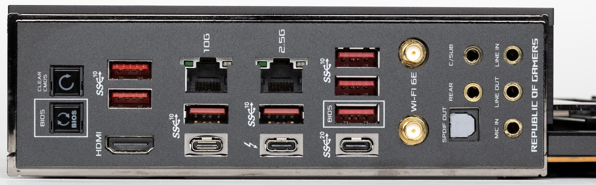 | Разъемы на задней панели | 1 × USB 3.2 Gen2x2 (Type-C) 2 × USB 3.2 Gen2 (Type-C) 7 × USB 3.2 Gen2 (Type-A) 2 × RJ-45 5 аудиоразъемов типа миниджек 1 × S/PDIF (оптический, выход) 1 × HDMI 2.1 2 антенных разъема кнопка сброса CMOS кнопка перепрошивки BIOS — Flashback |