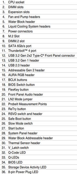 | Прочие внутренние элементы | 24-контактный разъем питания ATX 2 8-контактный разъем питания EPS12V 1 6-контактный разъем питания PCIe 1 слот M.2 (E-key), занят адаптером беспроводных сетей 1 разъем для подключения порта USB 3.2 Gen2x2 Type-C 1 разъем USB 3.2 Gen2 Type-C 2 разъема для подключения 4 портов USB 3.2 Gen1 2 разъема для подключения 4 портов USB 2.0 8 разъемов для подключения 4-контактных вентиляторов и помп ЖСО 1 разъем для подключения неадресуемой RGB-ленты 3 разъема для подключения адресуемой ARGB-ленты 1 разъем аудио для передней панели корпуса 1 разъем для сброса CMOS 1 кнопка OC Retry 1 кнопка Safe Boot 1 переключатель Slow Mode 1 переключатель V_Latch 1 разъем для термодатчика 3 разъема подключения фирменных помп СВО Asus 2 разъема для подключения управления с передней панели корпуса 1 кнопка включения питания Power 1 кнопка перезагрузки Reset |