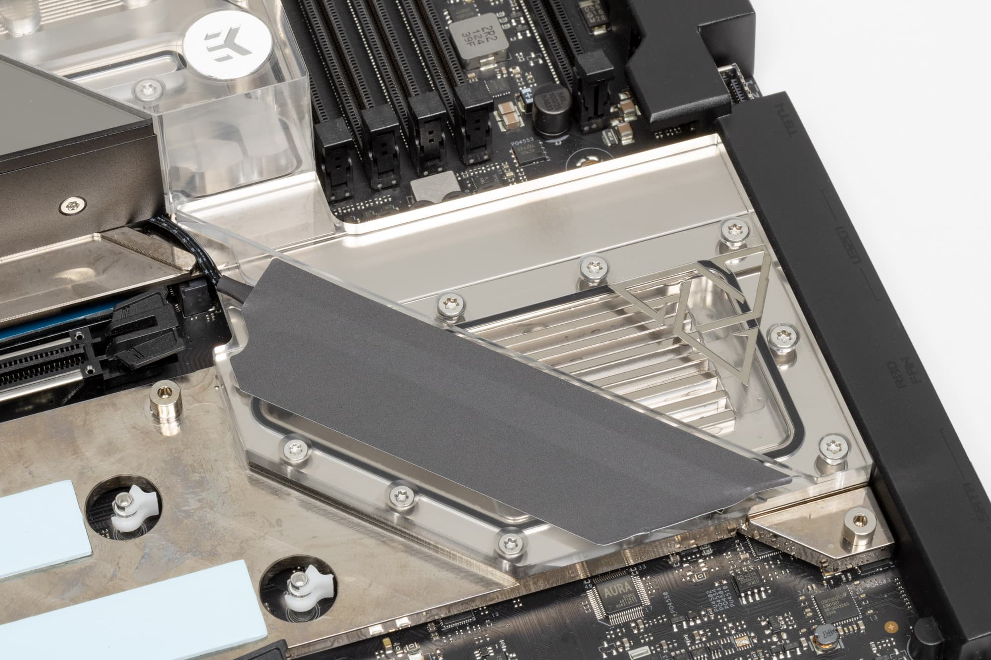 Все M.2 слоты охлаждением обеспечены по полной: М.2_1 покрыт водоблоком, а М.2_2 и М.2_3 имеют свой общий обширный радиатор.