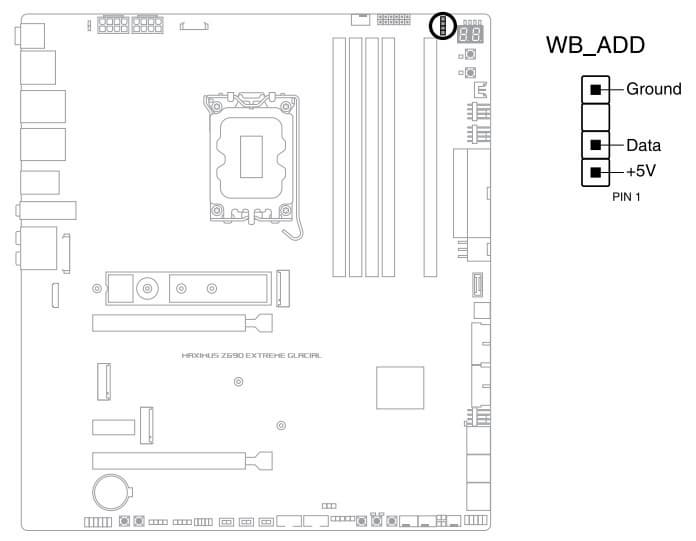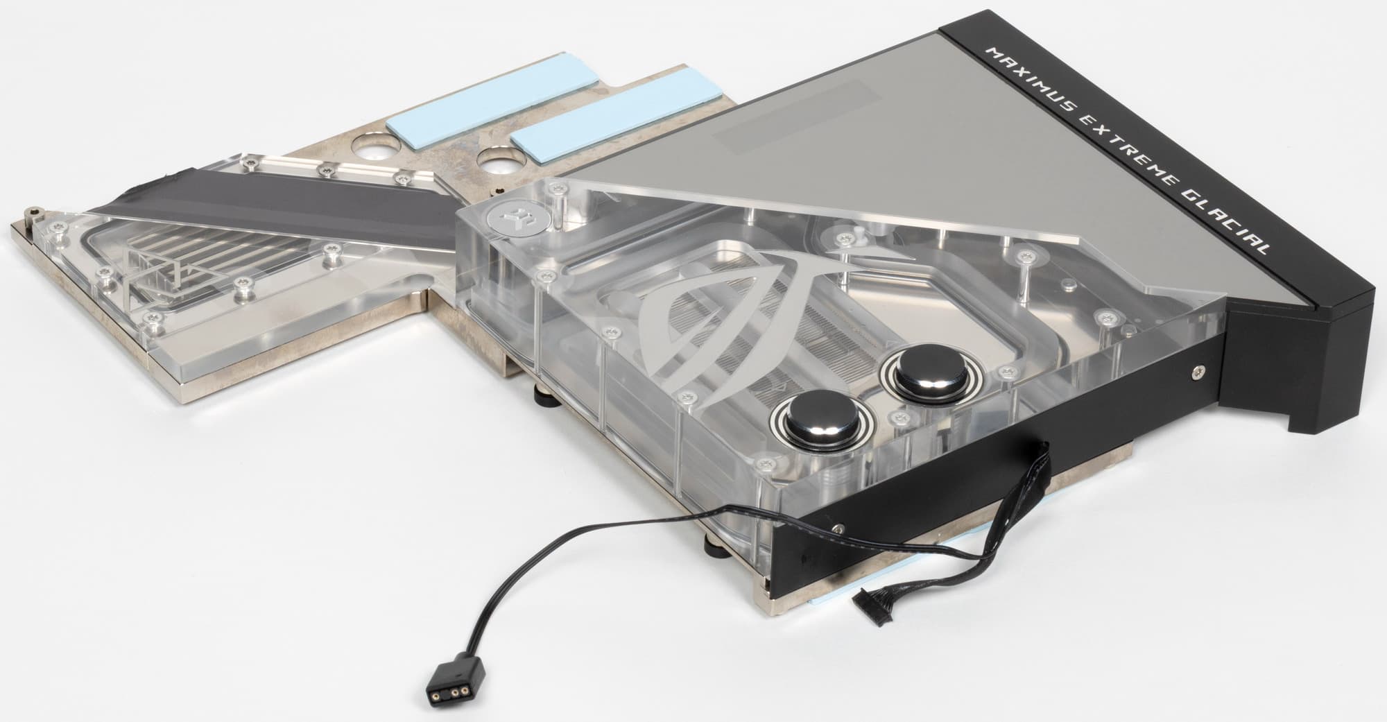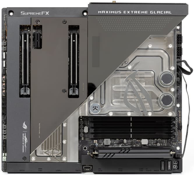 Форм-фактор ATX имеет размеры до 305×244 мм, а E-ATX — до 305×330 мм. Материнская плата Asus ROG Maximus Z690 Extreme Glacial имеет размеры 305×277 мм, поэтому выполнена в форм-факторе E-ATX, и на ней имеются 9 монтажных отверстий для установки в корпус. Однако следует иметь в виду, что три из девяти монтажных отверстий перекрыты водоблоком (при этом его следует монтировать на плату до установки ее в корпус).