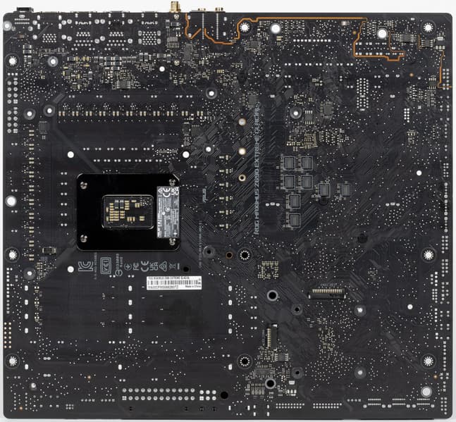 На оборотной стороне расположена некоторая логика. Текстолит обработан хорошо: во всех точках пайки не только острые концы срезаны, но и все неплохо отшлифовано. На задней стороне установлена пластина из алюминия с наноуглеродным покрытием. Она помогает отводить тепло от задней стороны PCB через термоинтерфейс и обеспечивает жесткость материнской платы. И я еще раз заострю внимание на том, что такую матплату вряд ли получится установить в корпусе, где в качестве опор для материнских плат используются не привычные всем латунные втулки, а выпрессованные возвышения, которые (по опыту) много шире, нежели выемки в задней пластине у материнки.