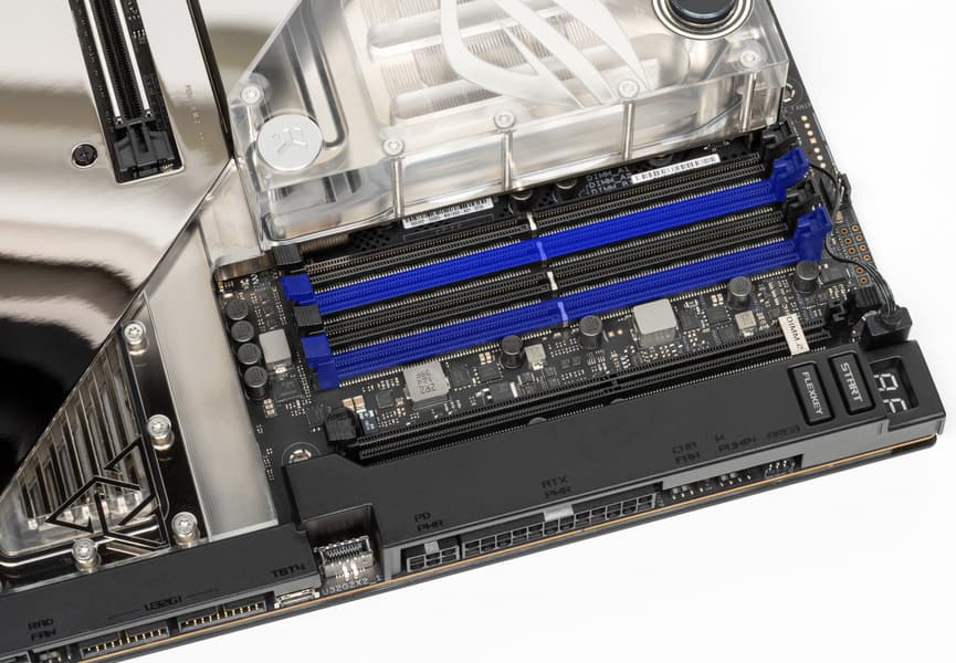 Для установки модулей памяти на плате Asus имеется четыре DIMM-слота (для работы памяти в Dual Channel в случае использования всего 2 модулей их следует устанавливать в А2 и B2. Плата поддерживает небуферизованную память DDR5 (non-EСС), а максимальный объем памяти составляет 128 ГБ. Разумеется, поддерживаются профили XMP.