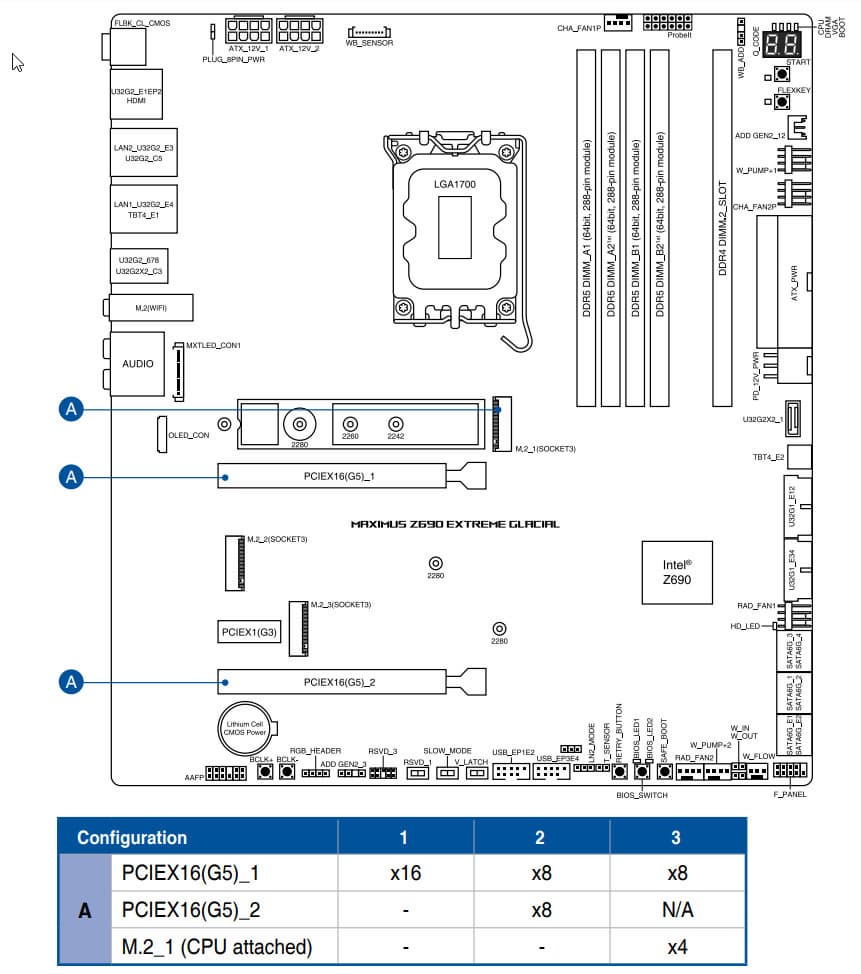 Теперь посмотрим выше на то, как работают процессоры в данной конфигурации. У CPU 12-го поколения всего 20 линий PCIe, 4 из них версии PCIe 4.0 отведены на порт М.2 (M.2_2). Оставшиеся 16 линий PCIe 5.0 надо делить на два слота PCIe x16 (_1 и _2) и порт М.2 (М.2_1). Вариантов переключения несколько: