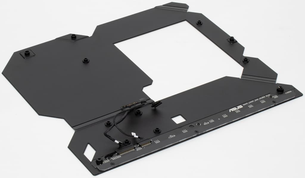 Материнская плата имеет бэкплейт с оборотной стороны, который не только защищает PCB от повреждений, но и несет элементы подсветки.