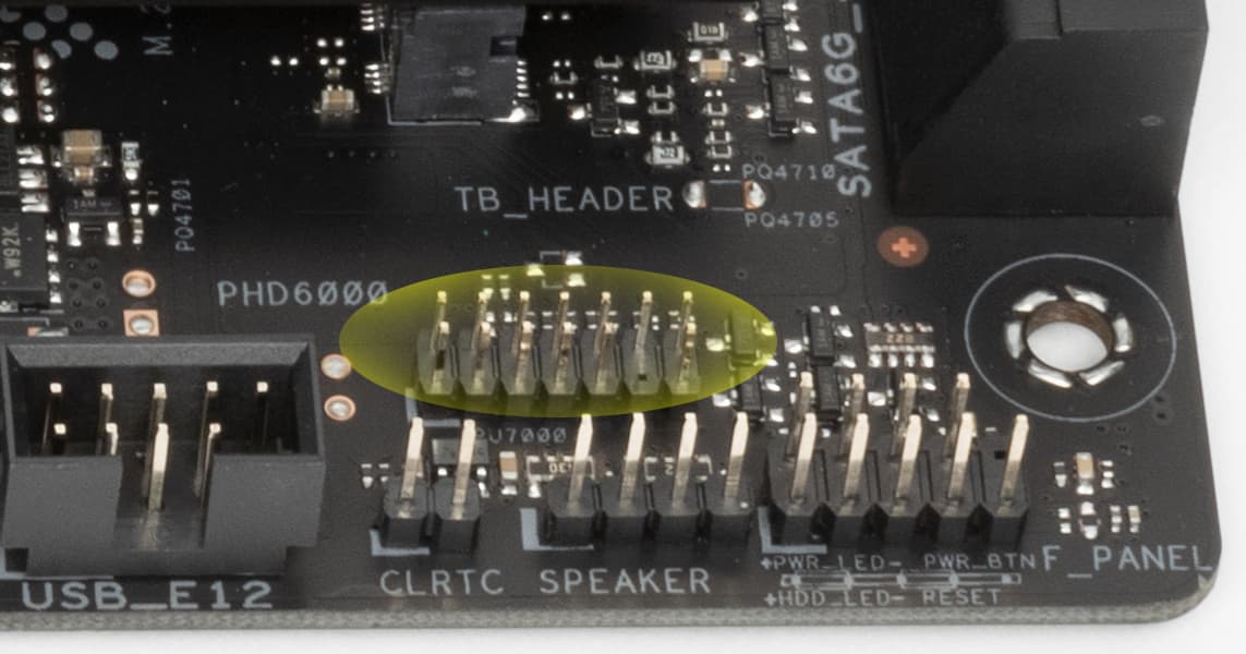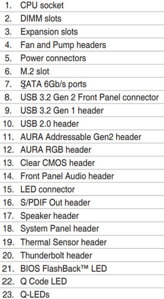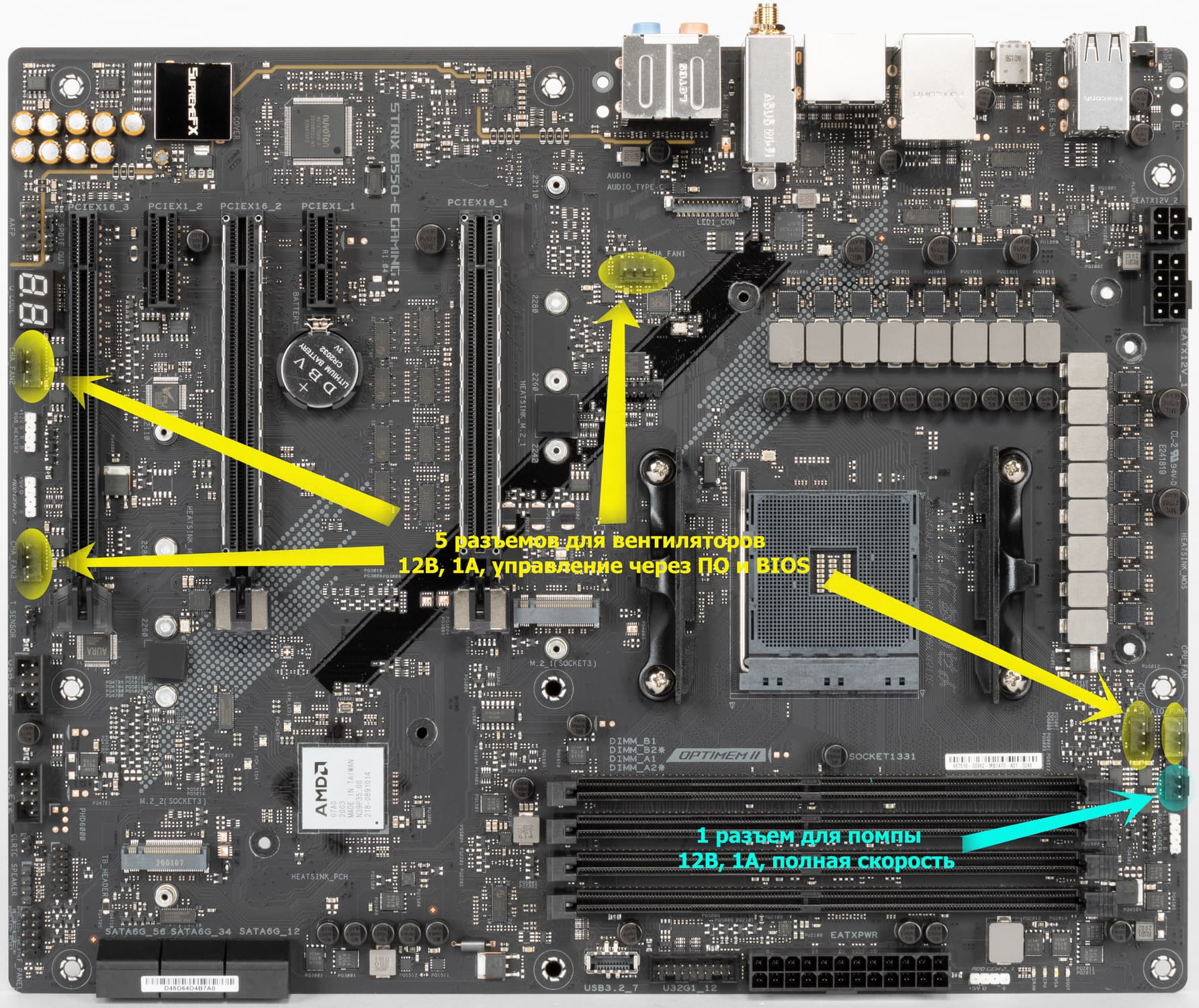 | Прочие внутренние элементы | 24-контактный разъем питания ATX 1 8-контактный разъем питания EPS12V 1 4-контактный разъем питания EPS12V 1 слот M.2 (E-key), занят адаптером беспроводных сетей 1 разъем для подключения портов USB 3.2 Gen2 Type-C 1 разъем для подключения 2 портов USB 3.2 Gen1 2 разъема для подключения 4 портов USB 2.0 6 разъемов для подключения 4-контактных вентиляторов и помп ЖСО 2 разъема для подключения неадресуемой RGB-ленты 2 разъема для подключения адресуемой ARGB-ленты 1 разъем аудио для передней панели корпуса 1 разъем Thunderbolt 1 разъем S/PDIF 2 разъема для подключения управления с передней панели корпуса 1 разъем подключения термодатчика |