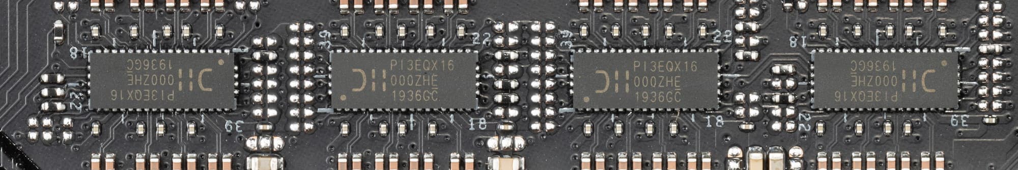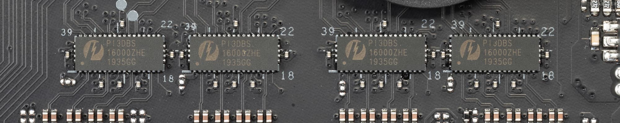У данной платы распределение линий PCIe между слотами PCIe x16 в случае использования более одной видеокарты неоднозначное, поэтому востребованы мультиплексоры PI3DBS от Pericom.