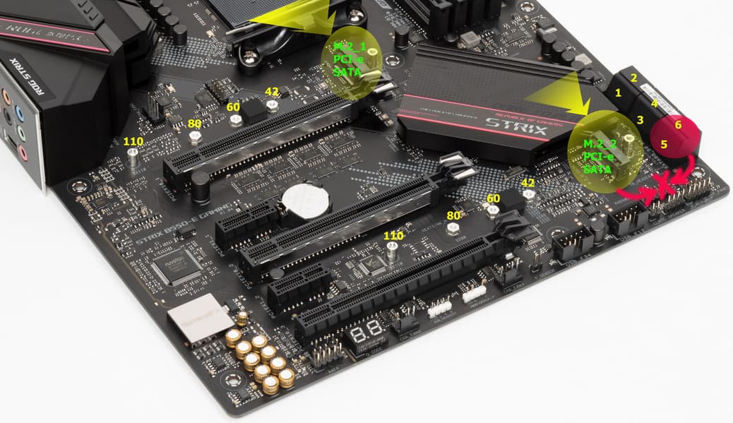 Оба слота M.2 поддерживают модули с любым интерфейсом (и размера до 22110 включительно). Второй M.2_2 получает данные от чипсета B550 и делит ресурсы с портами SATA 5 и 6.