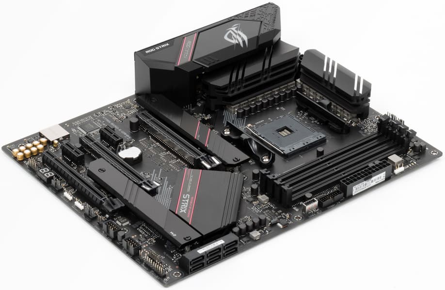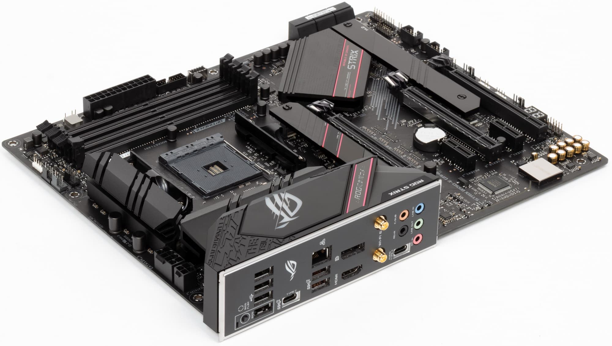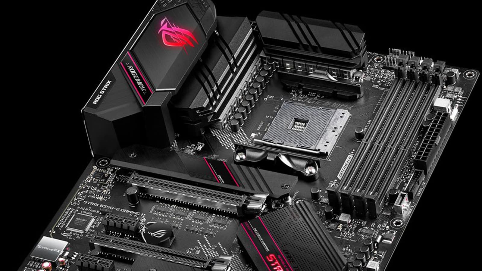 Вторые — это серия ROG Strix (плюс название чипсета), где уже могут быть как топовые чипсеты, так и среднебюджетные. Вот наша плата как раз относится к этой серии — ROG Strix B550-E Gaming.
