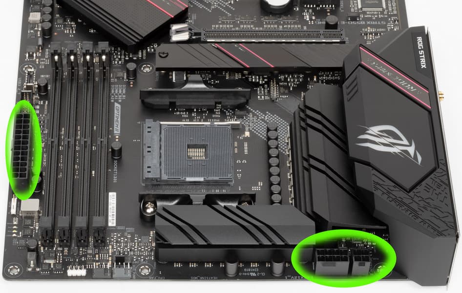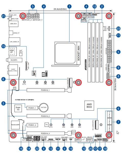 Форм-фактор ATX имеет размеры до 305×244 мм, а E-ATX — до 305×330 мм. Материнская плата ROG Strix B550-E Gaming имеет размеры 305×244 мм, поэтому выполнена в форм-факторе ATX, и на ней имеются 9 монтажных отверстий для установки в корпус.