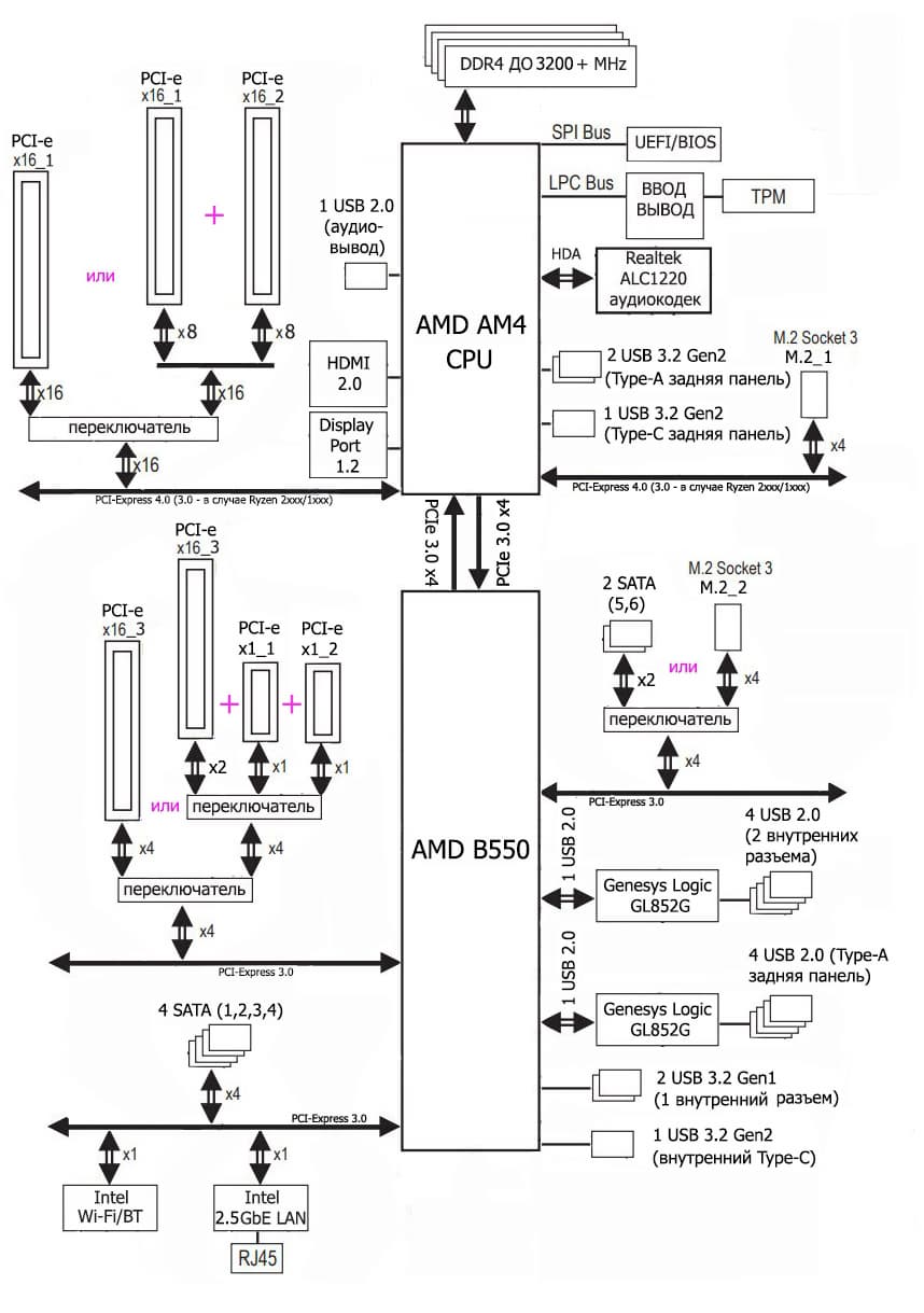 Процессоры Ryzen 3000 суммарно имеют 24 линии ввода-вывода (включая PCI-e 4.0). 4 линии (в данном случае превращаясь в PCI-e 3.0) идут на связь с чипсетом B550. Еще 16 линий — это PCI-e слоты для видеокарт. Осталось 4 линии: они могут конфигурироваться производителями материнских плат на выбор (либо-либо):