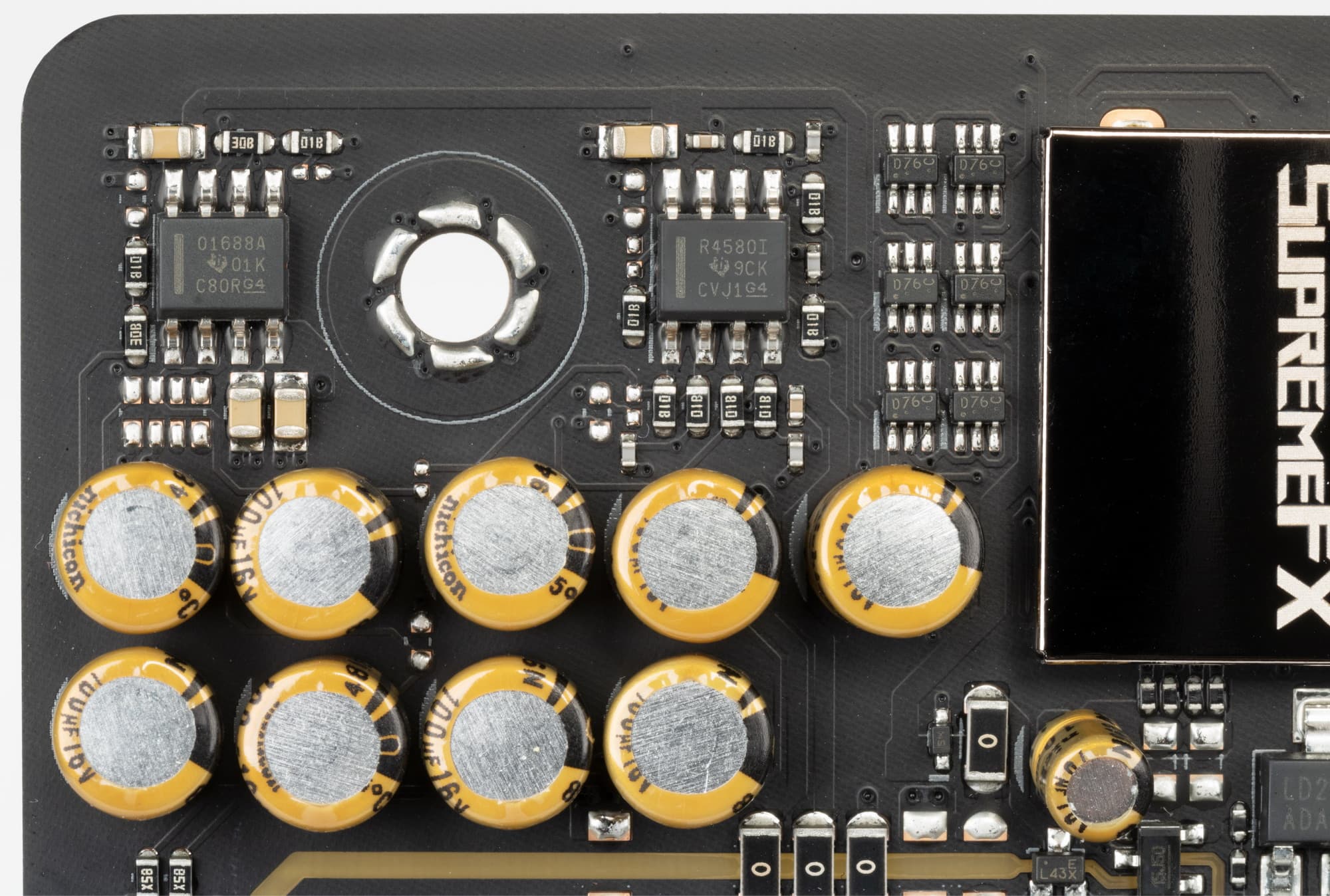В аудиоцепях платы применяются «аудиофильские» конденсаторы Nichicon Fine Gold .
