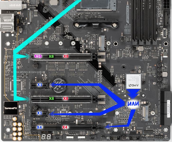 Ниже полная схема распределения ресурсов по слотам PCI-e