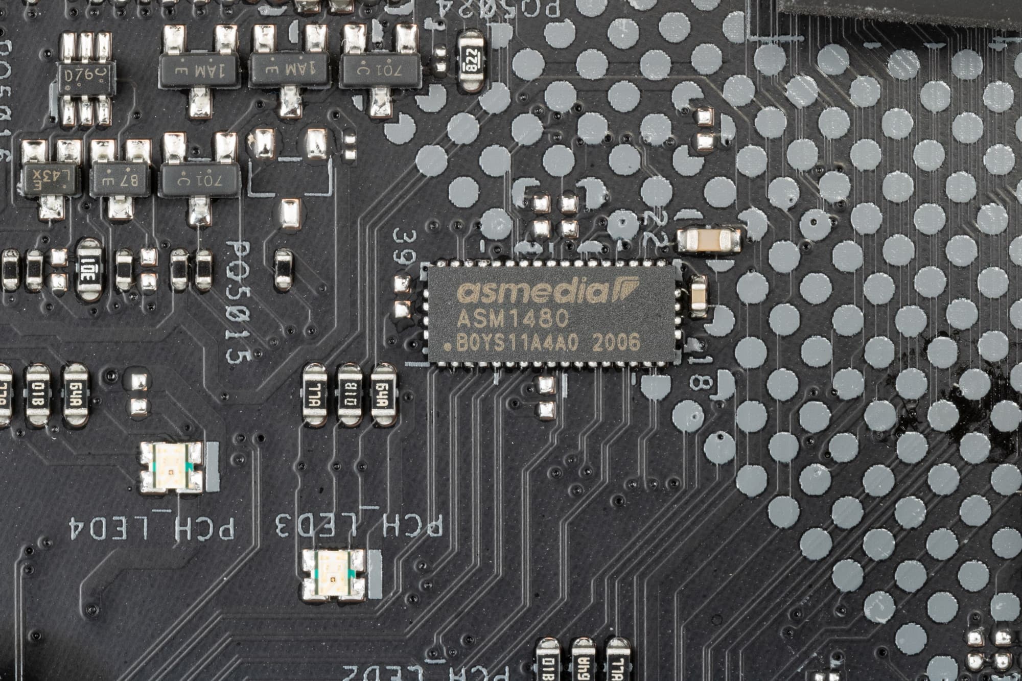 Также необходимо переключение слотов PCIe x16_3 и PCIe x1, для этих целей используется мультиплексор ASM1480 от ASMedia.
