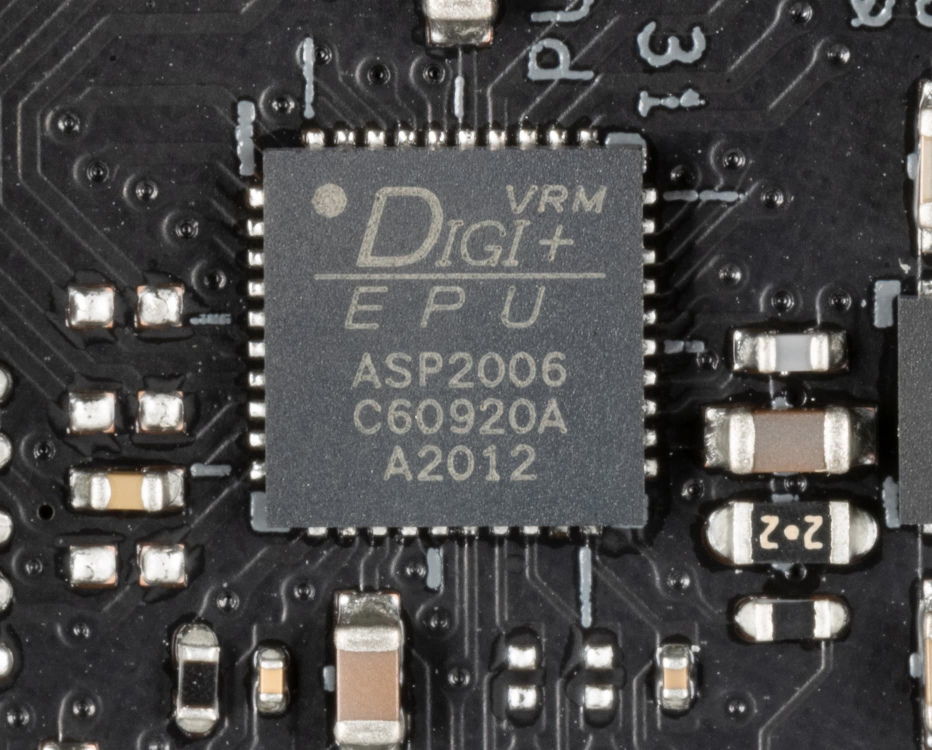 Традиционно для ROG используются цифровые контроллеры серии Digi+. Но впервые я встречаю вот такой: Digi+ EPU ASP2006. Поискав по тематическим форумам, я нашел, что этот контроллер рассчитан максимум на 8 фаз. И на плате такой контроллер один.