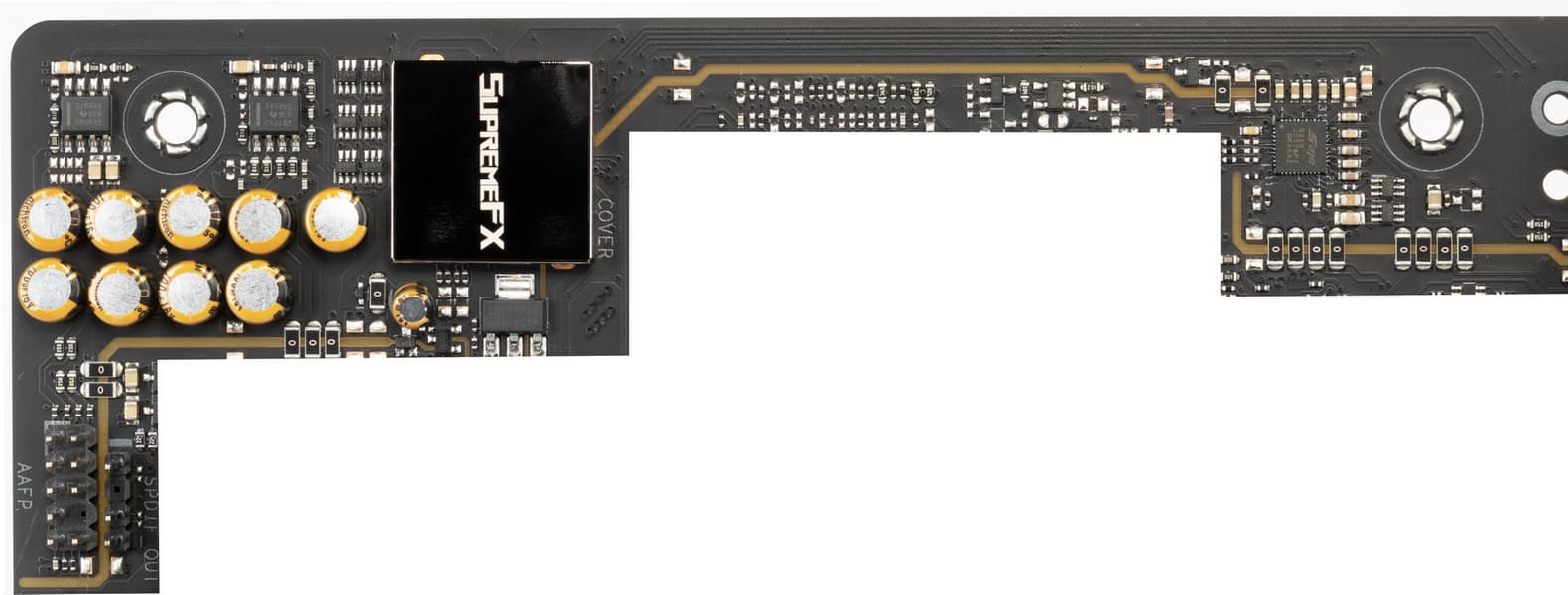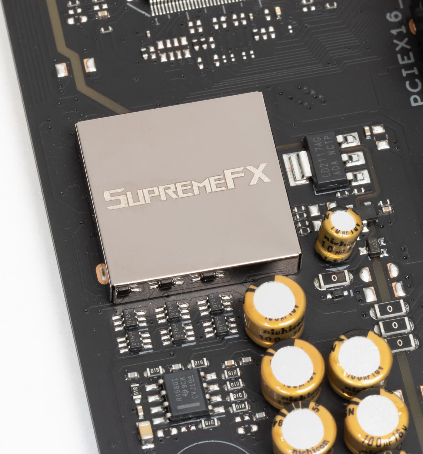 Как и во всех современных материнских платах звуком заведует аудиокодек Realtek ALC1220 (он и в данном случае есть — просто Asus всегда его во что-то перемаркировывает, в данном случае в SupremeFX). Он обеспечивает вывод звука по схемам до 7.1.