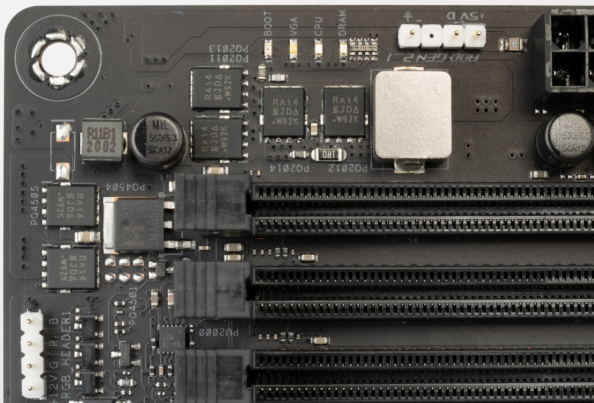В отличие от слотов для памяти, два слота PCIe x16_1/2 имеют металлическое армирование из нержавеющей стали, которое увеличивает их надежность (что может быть важным в случае довольно частой смены видеокарт, но что более важно: такой слот легче выдержит нагрузку на изгиб в случае установки очень тяжелой видеокарты топового уровня). Кроме того, такая защита предохраняет слоты от электромагнитных помех.