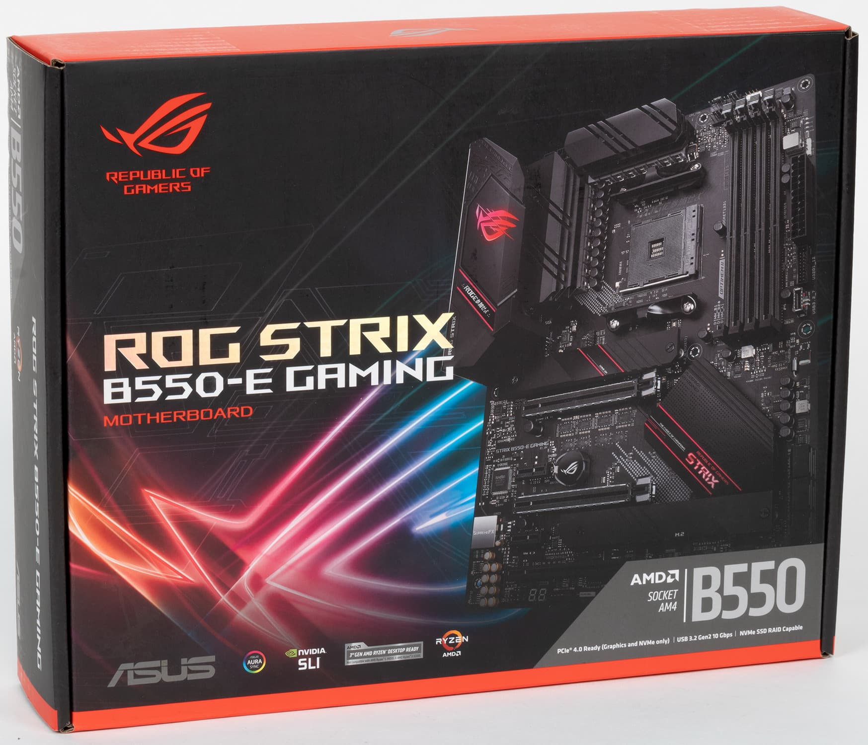 ROG Strix B550-E Gaming поставляется в стандартной картонной коробке с фирменным дизайном ROG (впрочем малозаметный логотип Asus также присутствует, так что пока бренд ROG тесно связан с Asus).