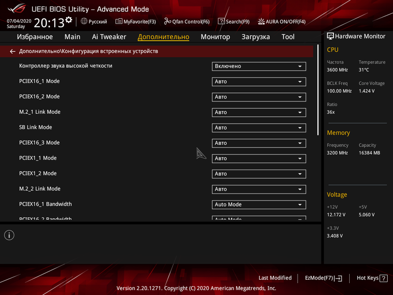 Теперь посмотрим выше на то, как работают процессоры в данной конфигурации. У всех CPU этого плана всего 20 линий PCIe (плюс 4 линии на даунлинк с чипсетом). И их надо делить на два слота PCIe x16 (_1 и _2) плюс слот M.2_1. В процессорах Ryzen встроен контроллер High Definition Audio (HDA), связь с аудиокодеком идет путем эмуляции PCI шины (есть ограничение на звук по схеме 7.1: до 32-бит/192 кГц). Варианты переключения слотов PCI-e x16 вот такие: