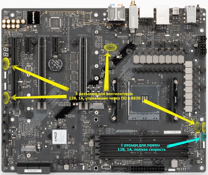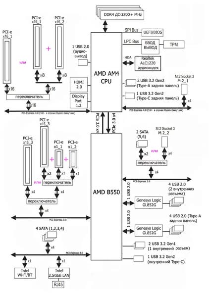 Плюс 14 линий PCIe, выделенные на поддержку иной периферии (включая те же самые контроллеры USB). Итого, у B550 в данном случае реализованы почти все его возможные порты.