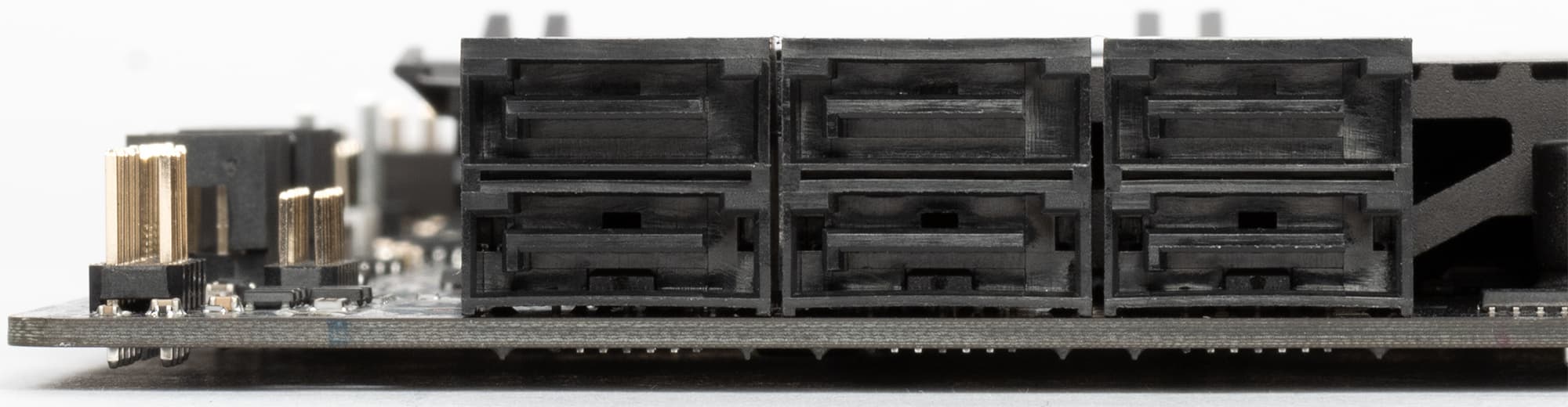 Всего у платы 6 разъемов Serial ATA 6 Гбит/с + 2 слота для накопителей в форм-факторе M.2. (Еще один слот M.2, спрятанный под кожухом блока разъемов задней панели, занят контроллером беспроводных сетей Wi-Fi/Bluetooth.). 6 портов SATA реализованы через чипсет B550 и поддерживают создание RAID.