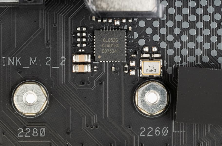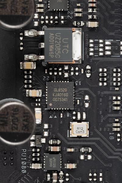 Контроллер Genesys Logic GL852G (4 USB 2.0 на 2х внутренних разъемах), а также второй GL852G (4 USB 2.0 на задней панели) используют линии портов USB 2.0. Также одна линия USB 2.0 используется для аудиовывода через Type-C и еще одна для связи с контроллером подсветки — Aura. Подробнее в разделе по USB-портам.