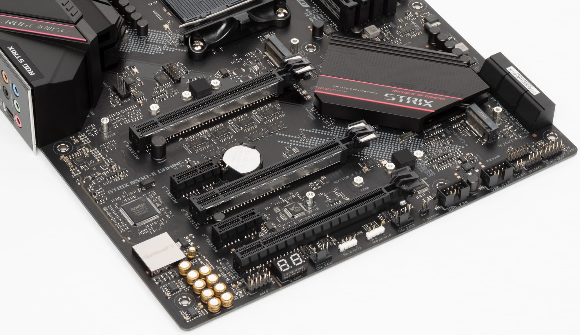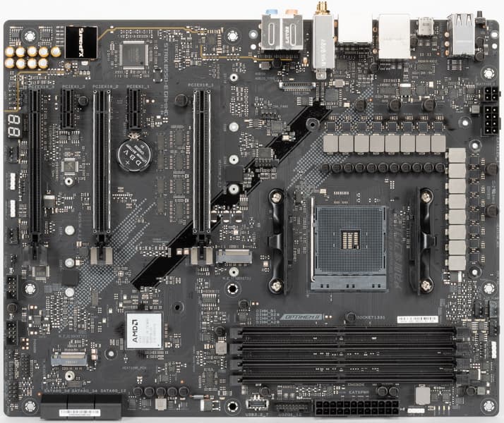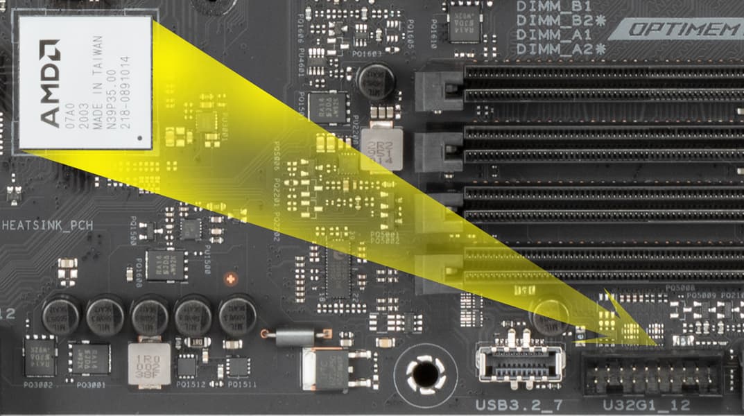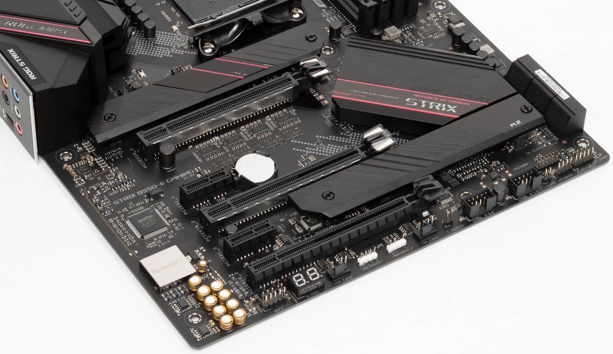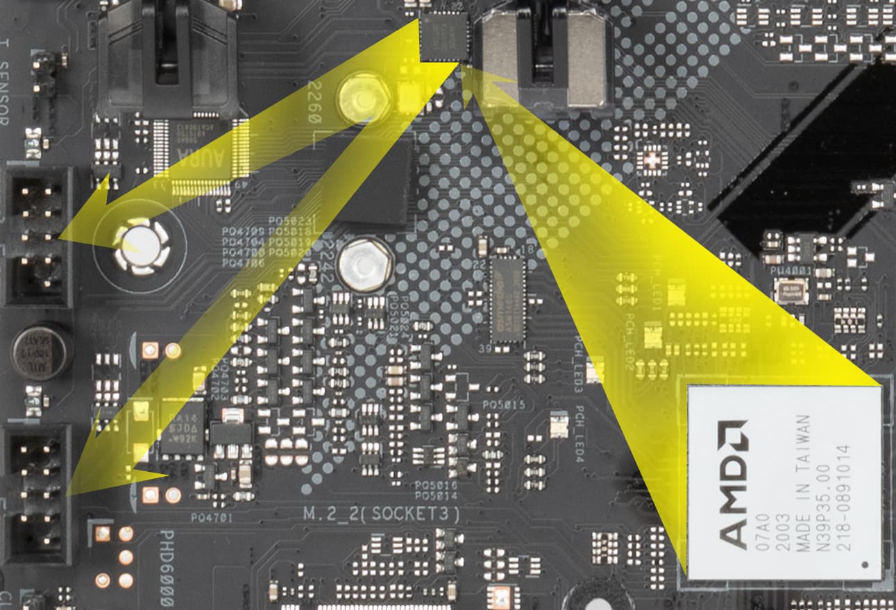 Напомню, что чипсет AMD B550 предусматривает поддержку процессоров Ryzen 3-го и будущего (4-го) поколений с PCIe 4.0, однако сам аппаратно реализует только PCIe 3.0. Это надо учитывать, размещая, например, накопители в слотах M.2 (ибо один из них подключается к процессору и потому реализует PCIe 4.0, а второй — к В550, и потому там скорость обмена информацией ограничена интерфейсом PCIe 3.0). Собственно, это и является одной из причин того, что чипсет не сильно греется и ему не требуется вентилятор, в отличие от AMD X570. Вторая причина низкого нагрева чипсета в том, что В550 произведен силами ASMedia по относительно тонкому техпроцессу, в отличие опять же от X570, который выпущен самой компанией AMD по более старому техпроцессу.