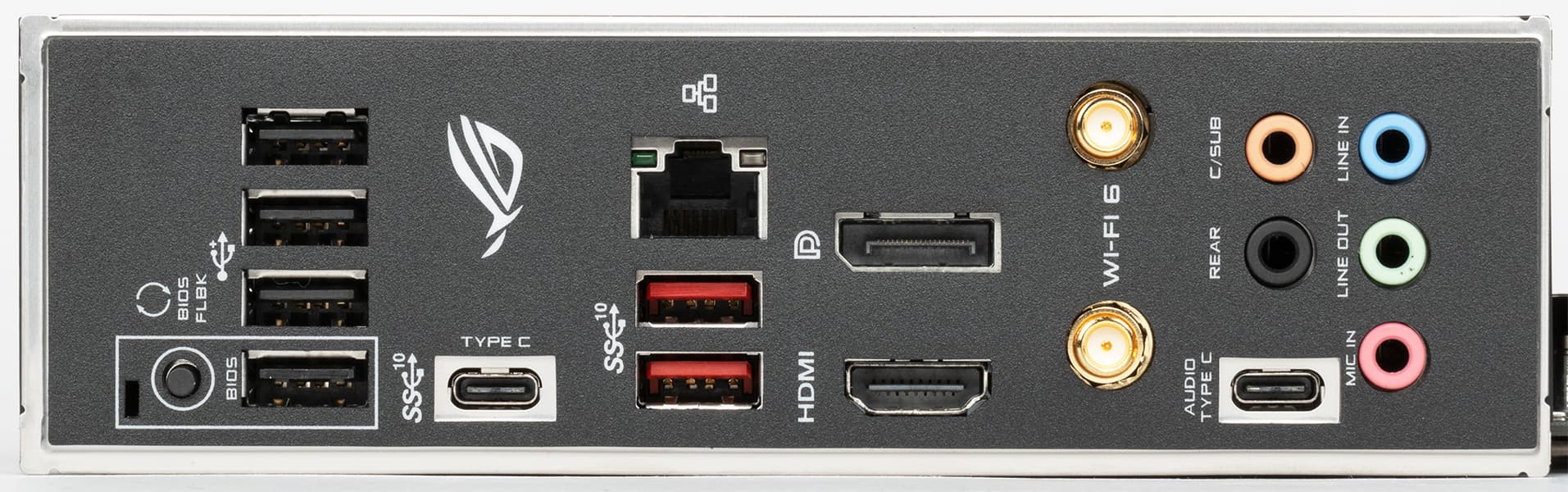 | Разъемы на задней панели | 1 × USB 3.2 Gen2 (Type-C) 2 × USB 3.2 Gen2 (Type-A) 4 × USB 2.0 (Type-A) 2 × RJ-45 5 аудиоразъемов типа миниджек 1 × USB Type-C (аудиовыход) 1 × HDMI 1 × DisplayPort 2 антенных разъема 1 кнопка перепрошивки BIOS — Flashback |