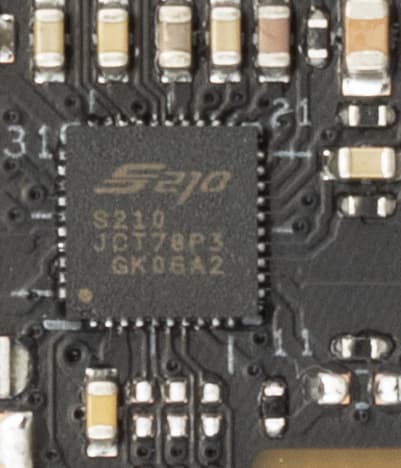 Аудиотракт вынесен на угловую часть платы, не пересекается с другими элементами. Разумеется, левый и правый каналы разведены по разным слоям печатной платы. Все аудиоразъемы на задней панели имеют привычную нам цветовую окраску. Особо надо отметить уникальное решение: впервые я вижу, что на материнской плате реализован вывод звука на наушники не только через обычный путь (на переднюю панель корпуса), но и через гнездо Type-C на задней панели специально для обладателей наушников с разъемом Type-C, которыми сейчас стали комплектоваться многие смартфоны топового уровня. Для распознавания подключения и задействования того или иного ОУ имеется процессор S210.