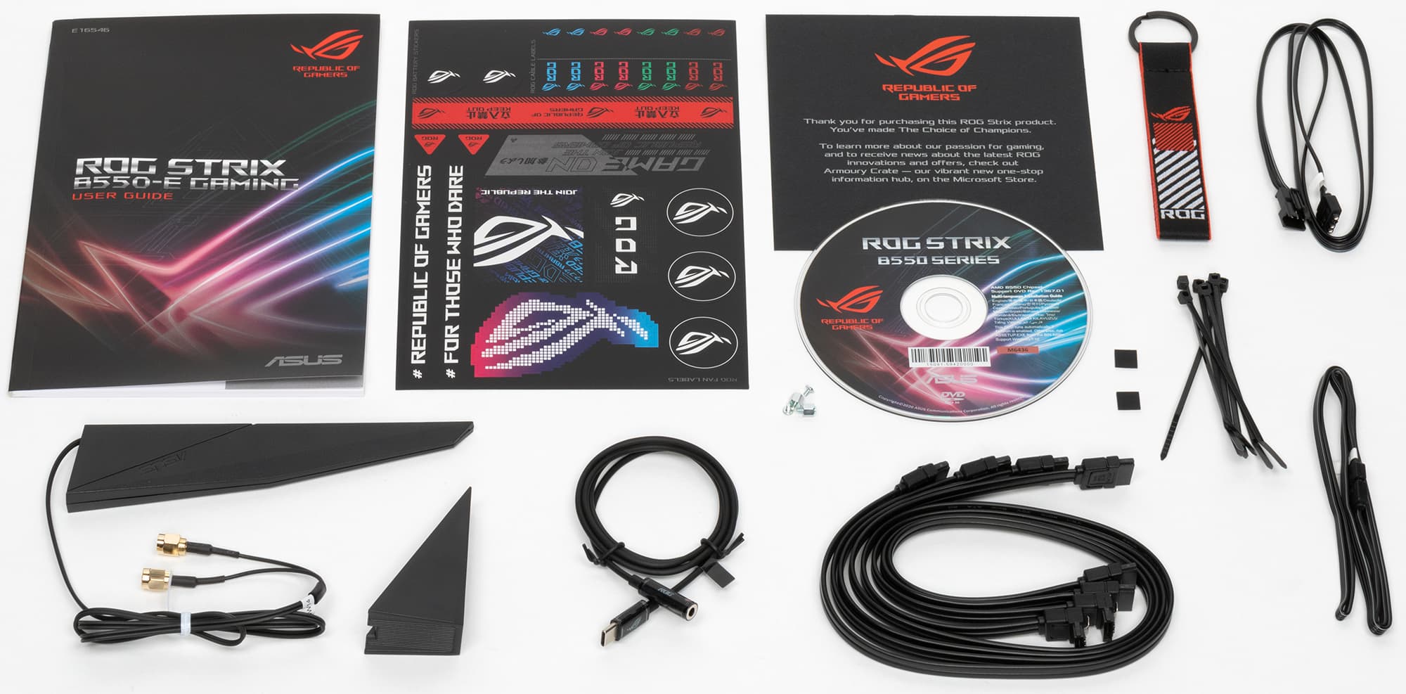 Комплект поставки не лишен изюминок. Кроме традиционных элементов типа руководства пользователя и кабелей SATA (что уже много лет является обязательным набором ко всем материнкам), имеются: выносная антенна с подставкой для беспроводных соединений, разветвители для подключения подсветок, винтики для монтажа модулей M.2, накопитель типа CD c ПО, адаптер для подключения наушников с 3.5" мини-джеком, бонусные стикеры, брелок и наклейки.