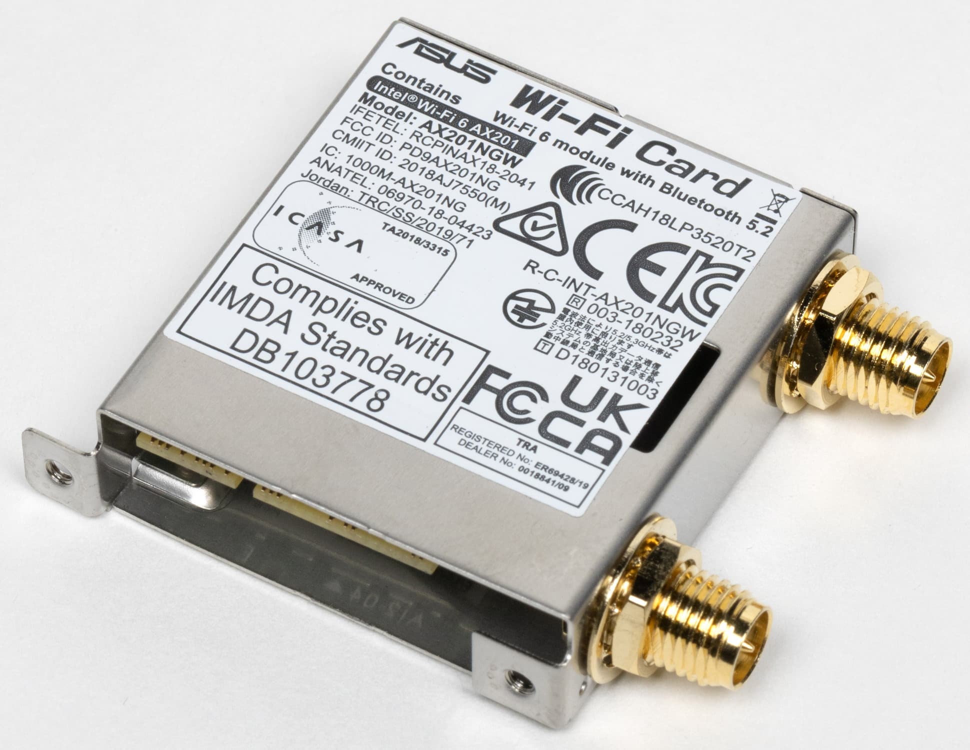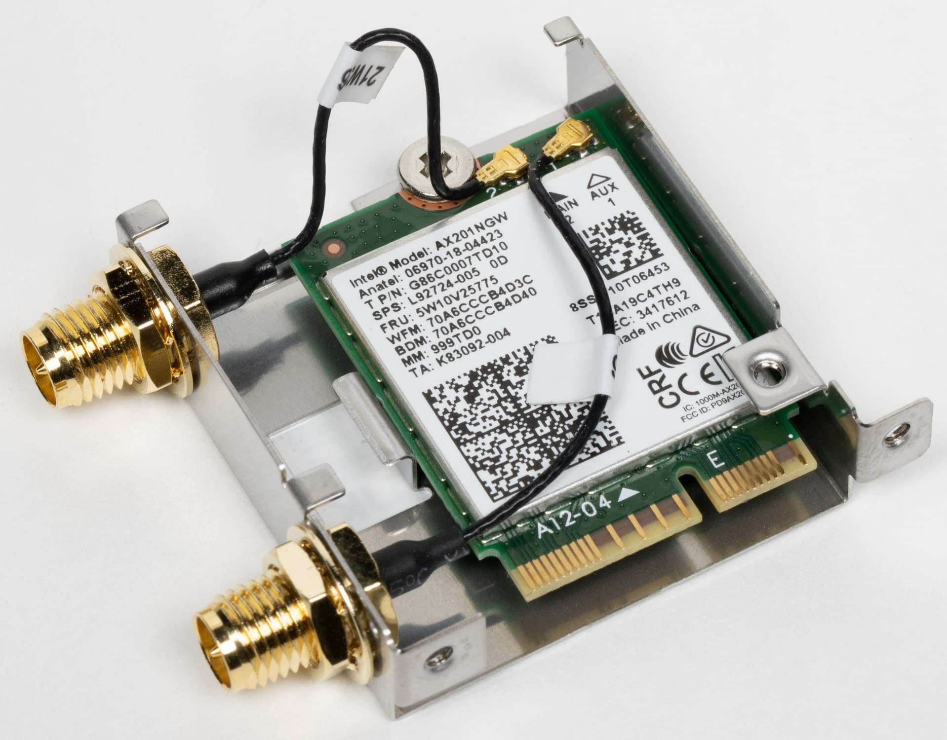 Имеется и комплексный беспроводной адаптер на контроллере Intel AX-201NGW, через который реализованы Wi-Fi 6 (802.11a/b/g/n/ac/ax) и Bluetooth 5.1. Он установлен в слот M.2 (E-key), и его разъемы для привинчивания выносных антенн выведены на заднюю панель.