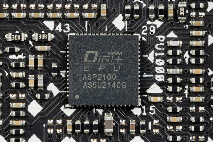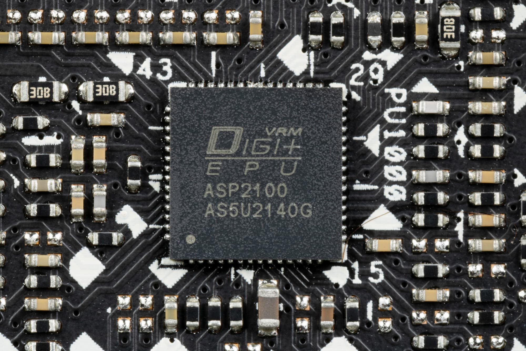 Управляет схемой питания VCore и iGPU фирменный ШИМ-контроллер Digi+ ASP2100.