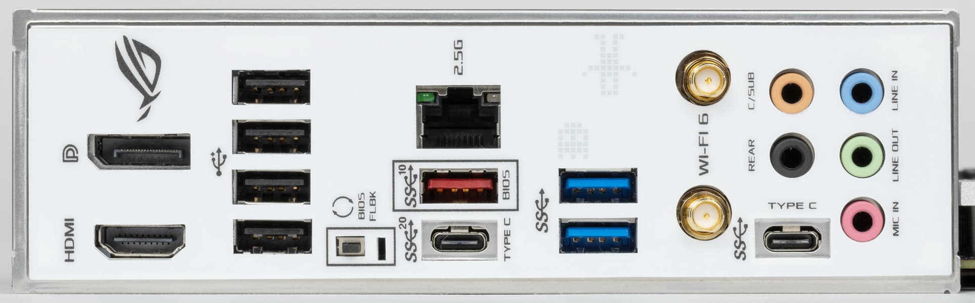 | Разъемы на задней панели | 1 × USB 3.2 Gen2x2 (Type-C) 1 × USB 3.2 Gen2 (Type-A) 1 × USB 3.2 Gen1 (Type-C) 2 × USB 3.2 Gen1 (Type-A) 4 × USB 2.0 (Type-A) 1 × RJ-45 5 аудиоразъемов типа миниджек 2 антенных разъема 1 разъем HDMI out 1 разъем Display Port out кнопка перепрошивки BIOS — Flashback |