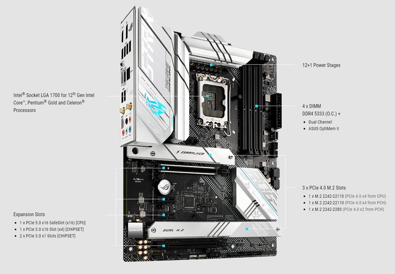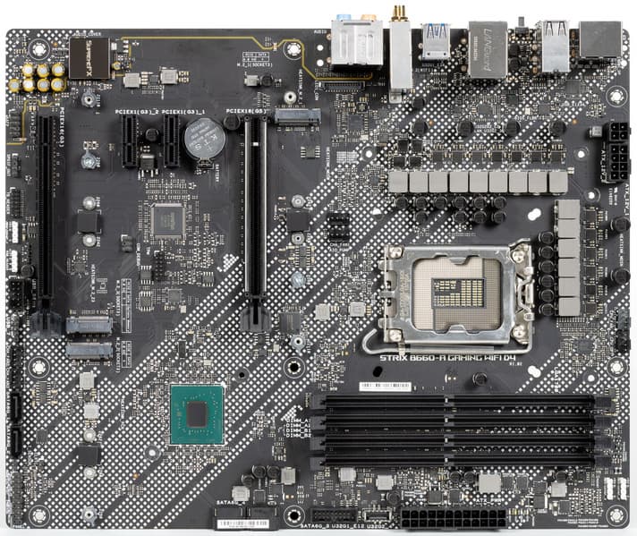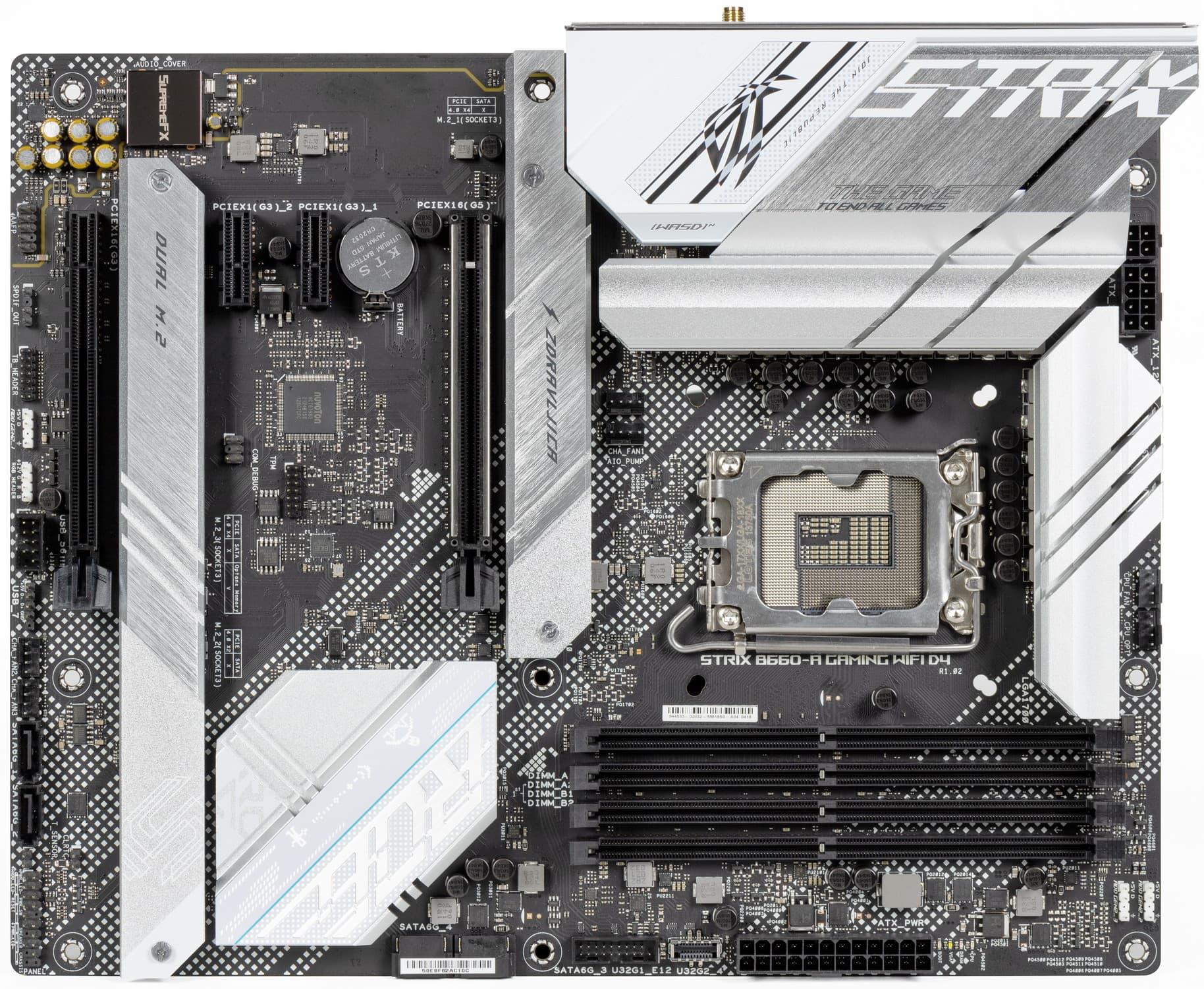 Материнская плата Asus ROG Strix B660-A Gaming WiFi D4 ориентирована на тех, кому не нужно максимально мощное «железо», но для кого важна стандартная современная поддержка периферии. По использованию чипсета B660 ясно, что плата в большей степени предназначена для процессоров среднего уровня. Однако она прекрасно работает даже с топовыми процессорами Intel Core 12-го поколения.