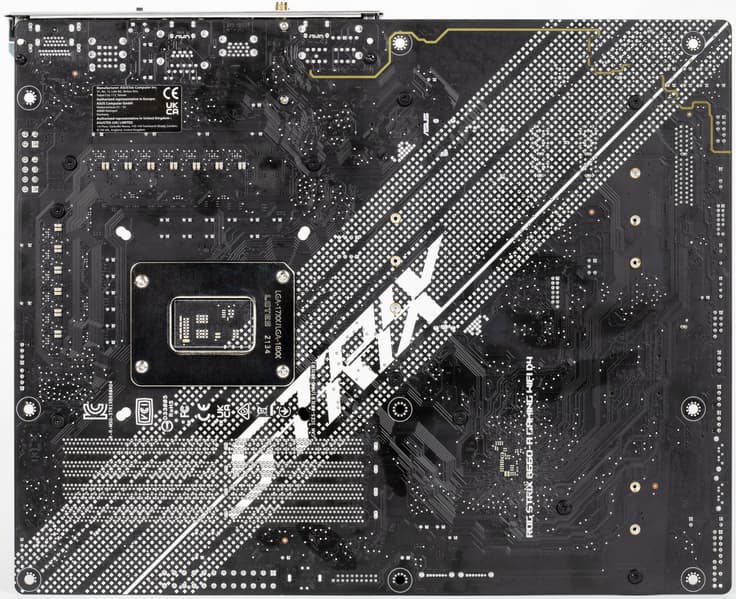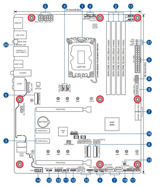 Форм-фактор Mini-ITX имеет размеры 170x170 мм, Micro-ATX до 244×244 мм, ATX до 305×244 мм, а E-ATX — до 305×330 мм. Материнская плата Asus ROG Strix B660-A Gaming WiFi D4 выполнена в форм-факторе ATX, имеет размеры 305×244 мм, и на ней имеются 9 монтажных отверстий для установки в корпус.