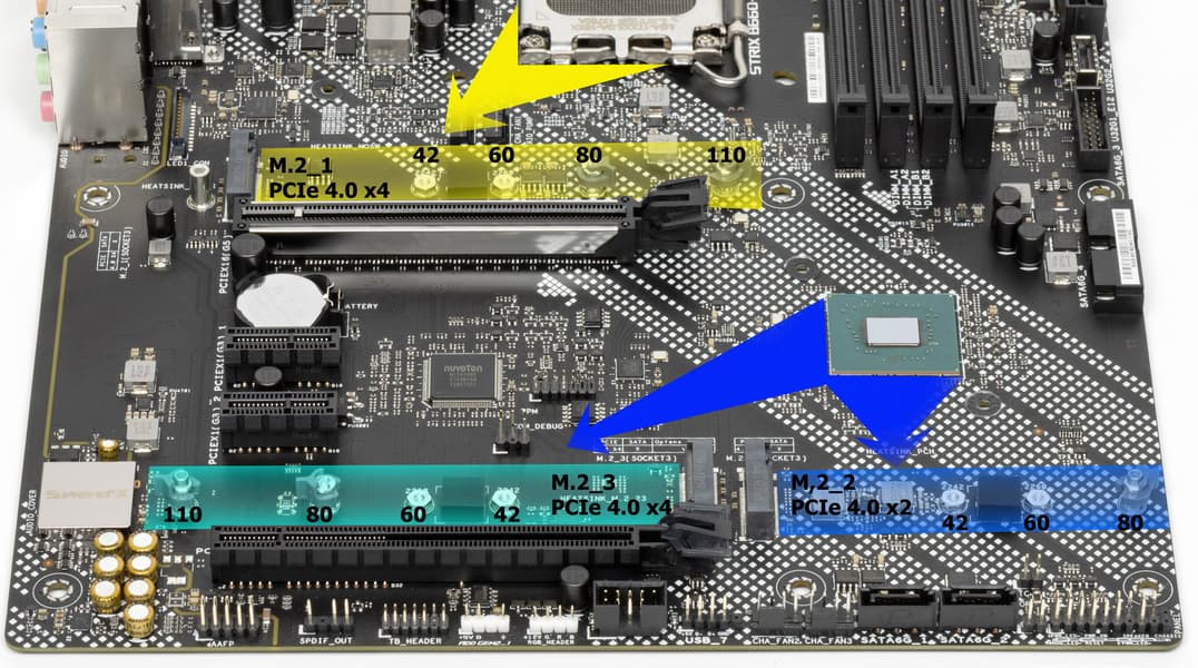 Все три слота работают с модулями только с PCIe интерфейсом 4.0. Первый M.2_1 получает данные от CPU (PCIe 4.0) и поддерживает размеры модулей 2242/2260/2280/22110.
