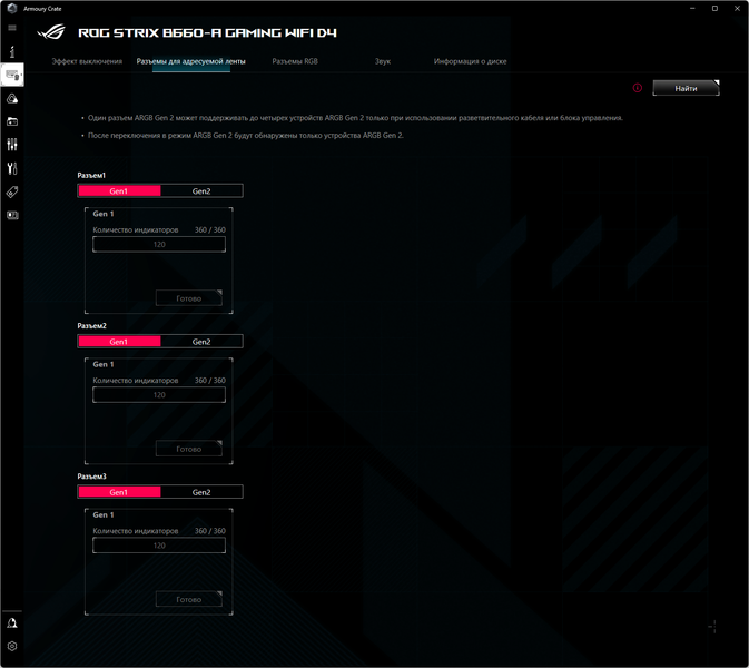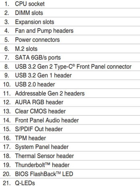 | Прочие внутренние элементы | 24-контактный разъем питания ATX 1 8-контактный разъем питания EPS12V 1 4-контактный разъем питания EPS12V 1 слот M.2 (E-key), занят адаптером беспроводных сетей 1 разъем для подключения порта USB 3.2 Gen2 Type-C 1 разъем для подключения 2 портов USB 3.2 Gen1 2 разъема для подключения 3 портов USB 2.0 6 разъемов для подключения 4-контактных вентиляторов и помп ЖСО 4 разъема для подключения адаптеров подсветки (1 разъем неадресуемой RGB-ленты, 3 разъема адресуемой ARGB-ленты) 1 разъем для подключения адаптера управления с передней панели корпуса 1 разъем S/PDIF |