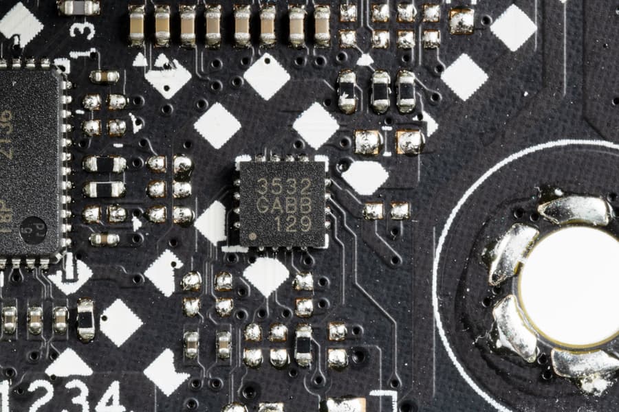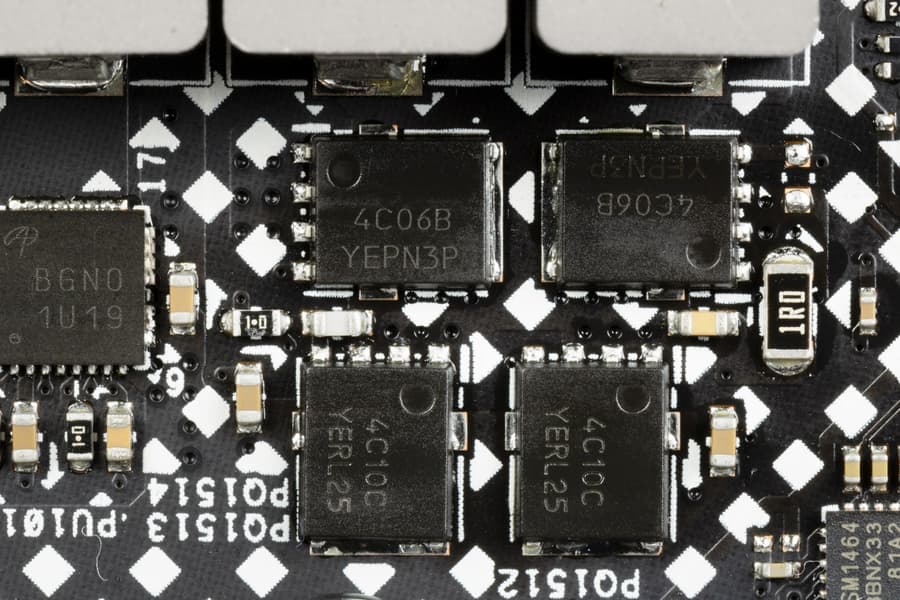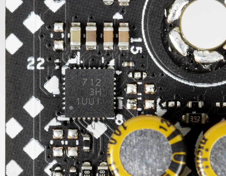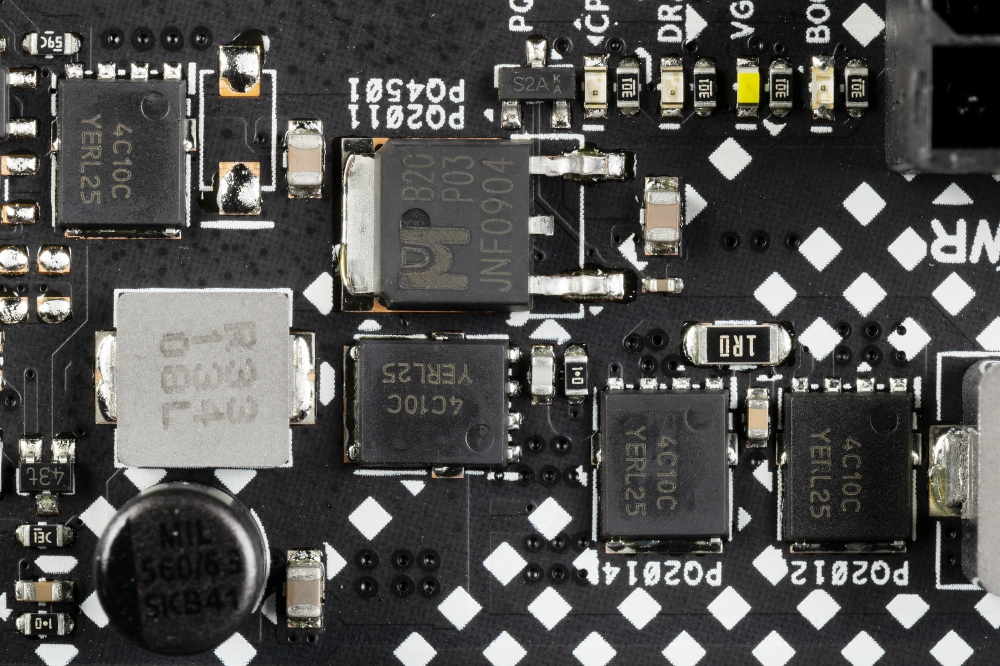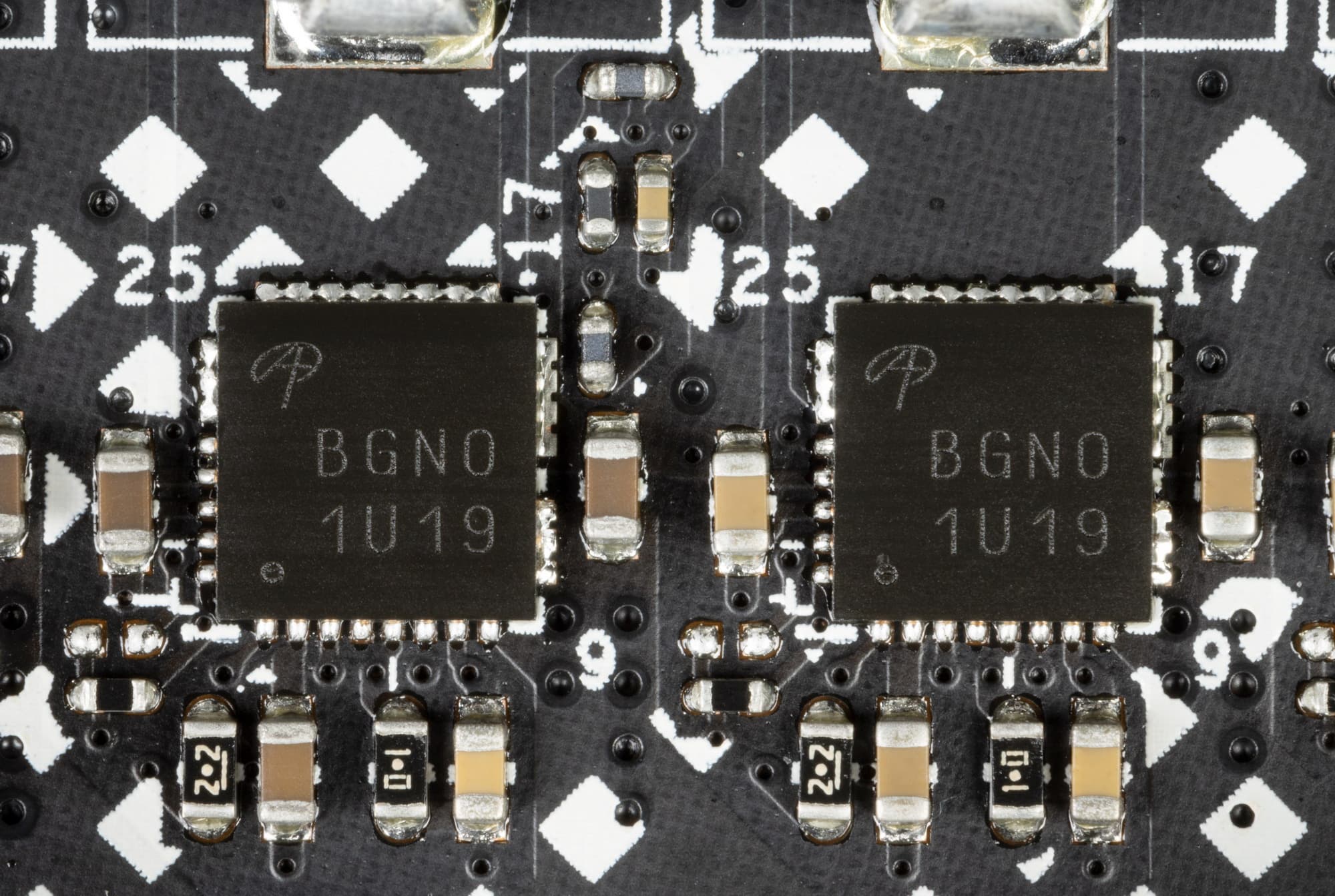 Каждый канал фазы имеет суперферритовый дроссель и AOZ5316UQI мосфеты от Alpha&Omega на 55А для VCore,