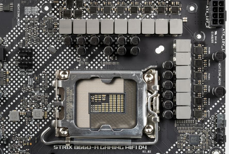 Asus ROG Strix B660-A Gaming WiFi D4 поддерживает процессоры Intel Core 12-го поколения, выполненные под разъем (сокет) LGA1700. Официально система крепления систем охлаждения для CPU несовместима с той, что для LGA1151/1200, однако все же ряд старых СО все же сможет быть применим, лишь придется где-то приобретать или заказывать у производителя комплект крепежа под LGA 1700. Дело в в том, что кулеры с жесткой установкой в матплате на фиксированную высоту могут не достать до 12ххх. Подойдут лишь СО с пружинистой посадкой подошвы на процессор. У данной платы, как и у всех в серии ROG имеются овальные отверстия для монтажа СО с крепежом под LGA 11xx/1200.