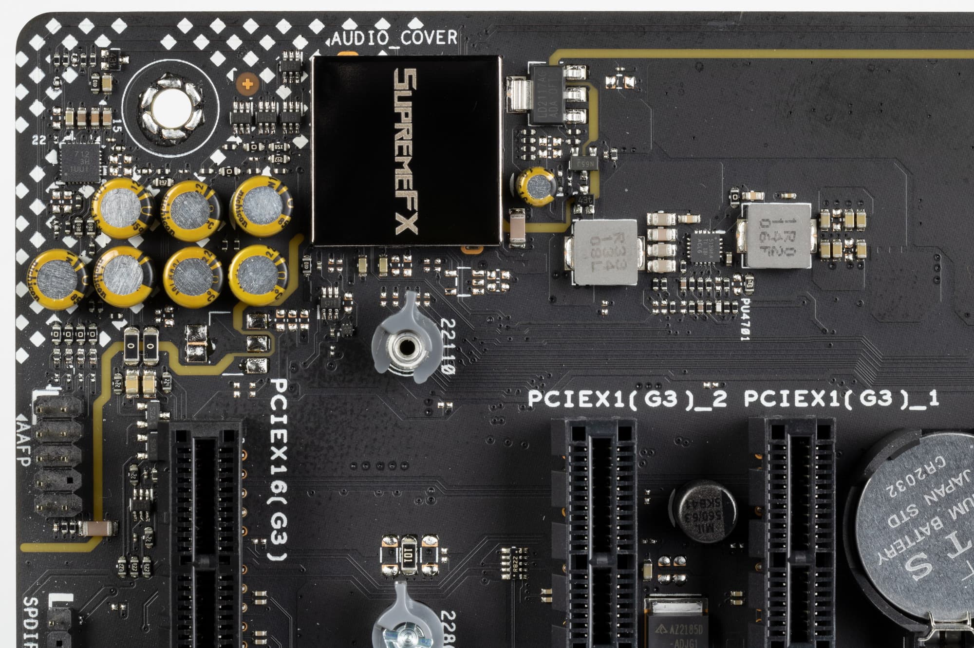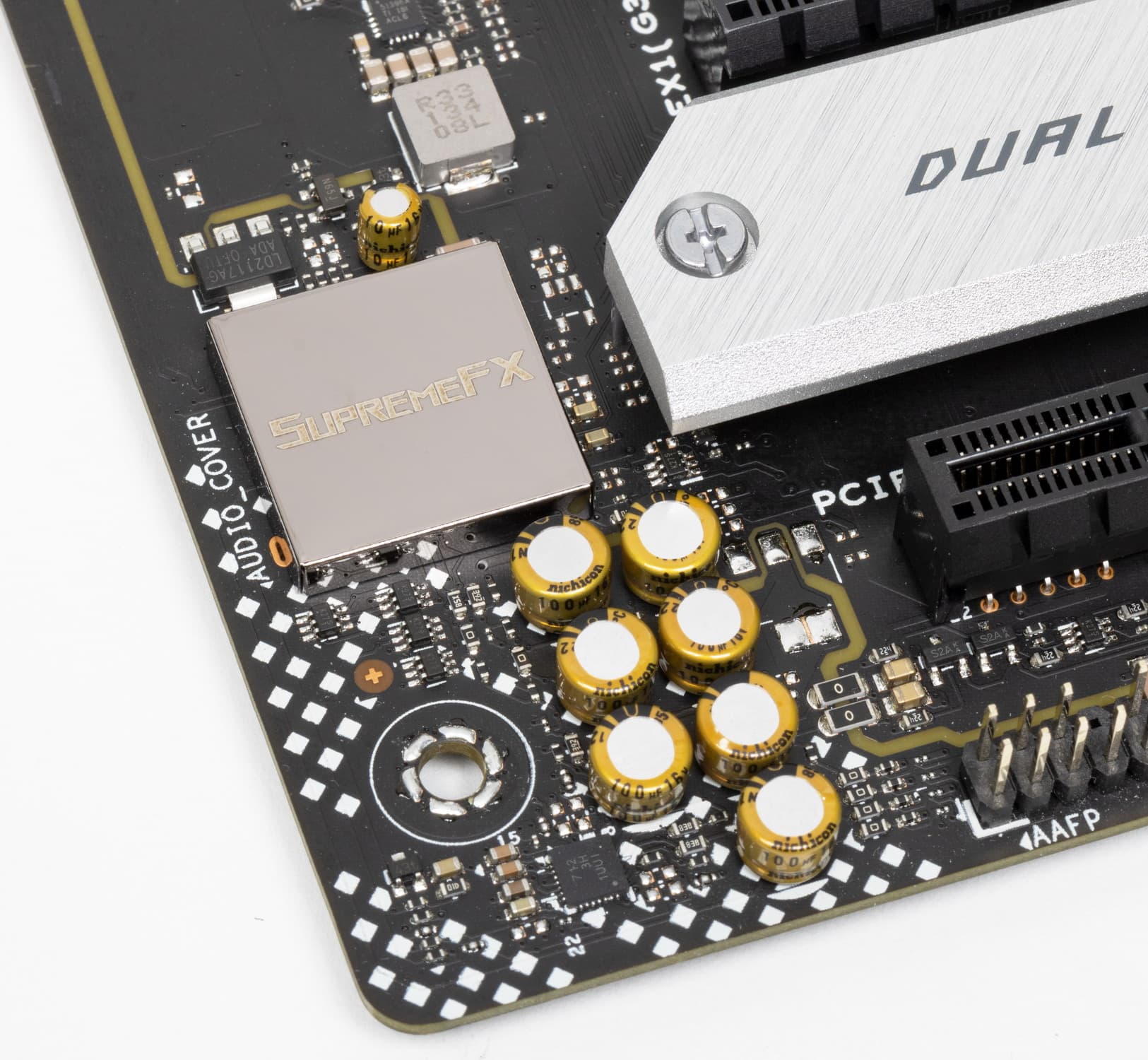 Много лет в большинстве современных материнских платах звуком заведуют аудиокодеки от Realtek семейства ALC, и долгое время это был ALC1220 (24 бит / 192 кГц), а сейчас многие производители ставят улучшенную версию ALC4080. Он обеспечивает вывод звука по схемам до 7.1 с разрешением до 32 бит / 384 кГц. В стиле Asus – закрывать аудиокодек фирменным колпачком SupremeFX.