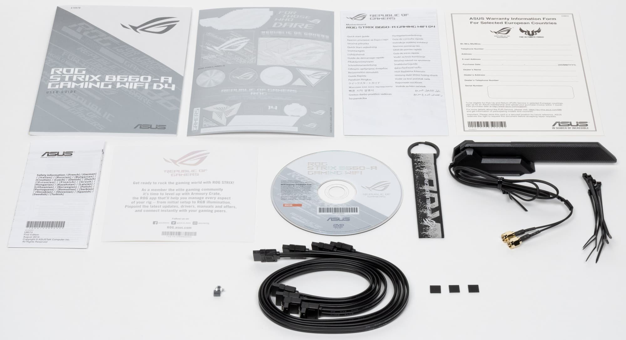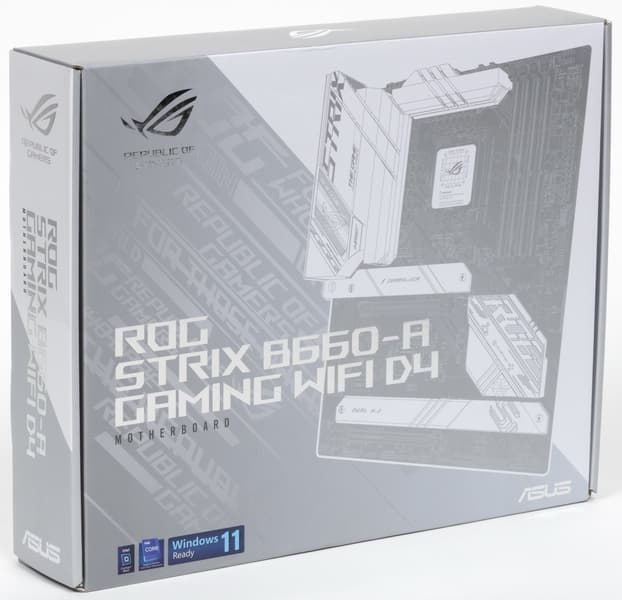 Asus ROG Strix B660-A Gaming WiFi D4 поставляется в стандартной коробке фирменного дизайна серии ROG (однако в серых тонах, как в традиционно черно-красных, подчеркивая расцветку радиаторов и кожухов на самой плате). Комплект размещен под платой в отдельном отсеке.