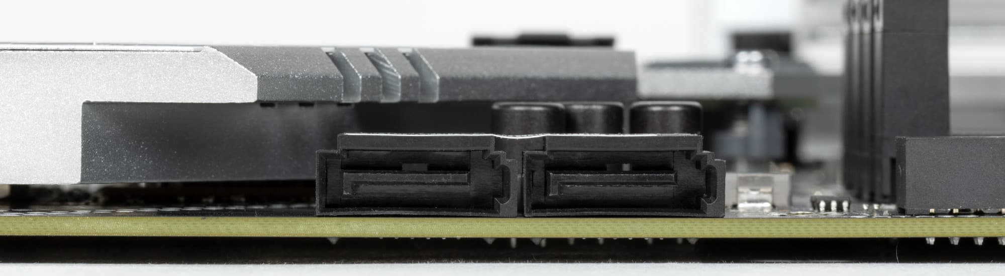 Порты SATA реализованы через чипсет B660 и поддерживают создание RAID. Размещены по-парно вдоль разных сторон платы.