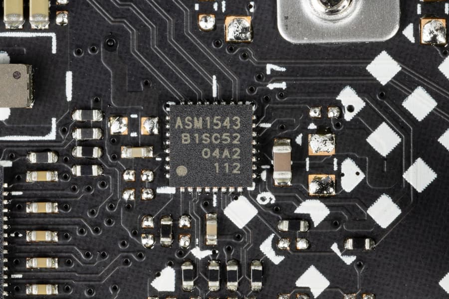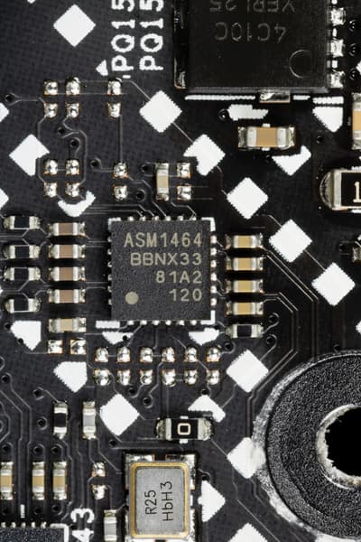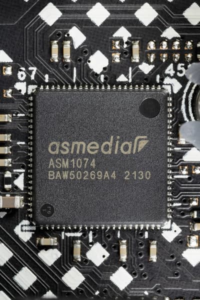- 5 портов USB 3.2 Gen1: 3 реализованы через хаб ASMedia ASM1074 (на него потрачена линия USB 2.0 от B660) и представлены на задней панели 2 портами Type-A (синего цвета) и 1 портом Type-C; остальные 2 реализованы через B660 и представлены внутренним разъемом на материнской плате на 2 порта;