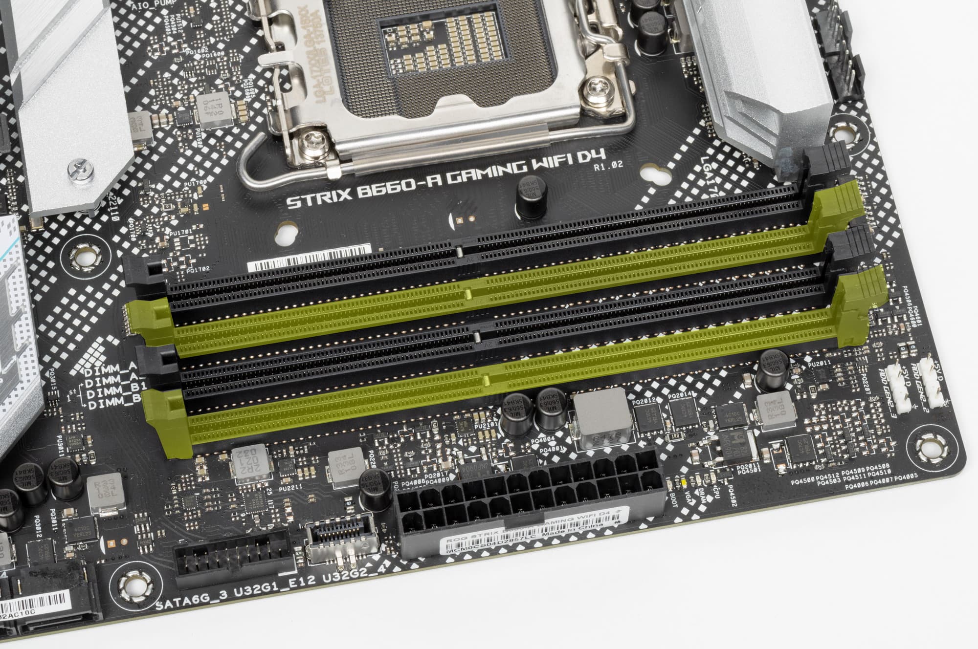 Для установки модулей памяти на плате Asus имеется 4 DIMM-слота (для работы памяти в Dual Channel в случае использования всего 2 модулей их следует устанавливать в А2 и B2, отмеченных на фото желтым цветом). Плата поддерживает небуферизованную память DDR4 (non-EСС), а максимальный объем памяти составляет 128 ГБ. Поддерживаются профили XMP.