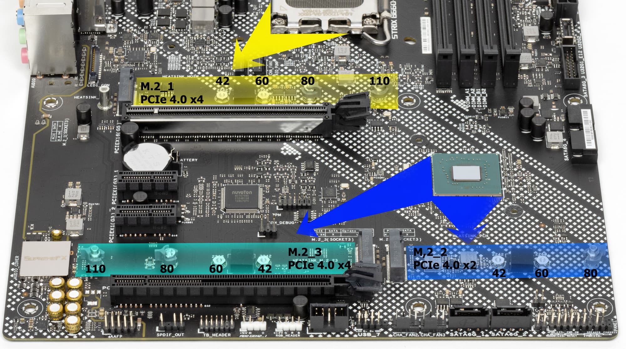 Второй M.2_2 и третий M.2_3 получают данные от чипсета B660. При этом M.2_2 поддерживает размеры модулей 2242/2260/2280/22110. А M.2_3, поддерживая размеры модулей 2242/2260/2280, работает только в режиме х2.