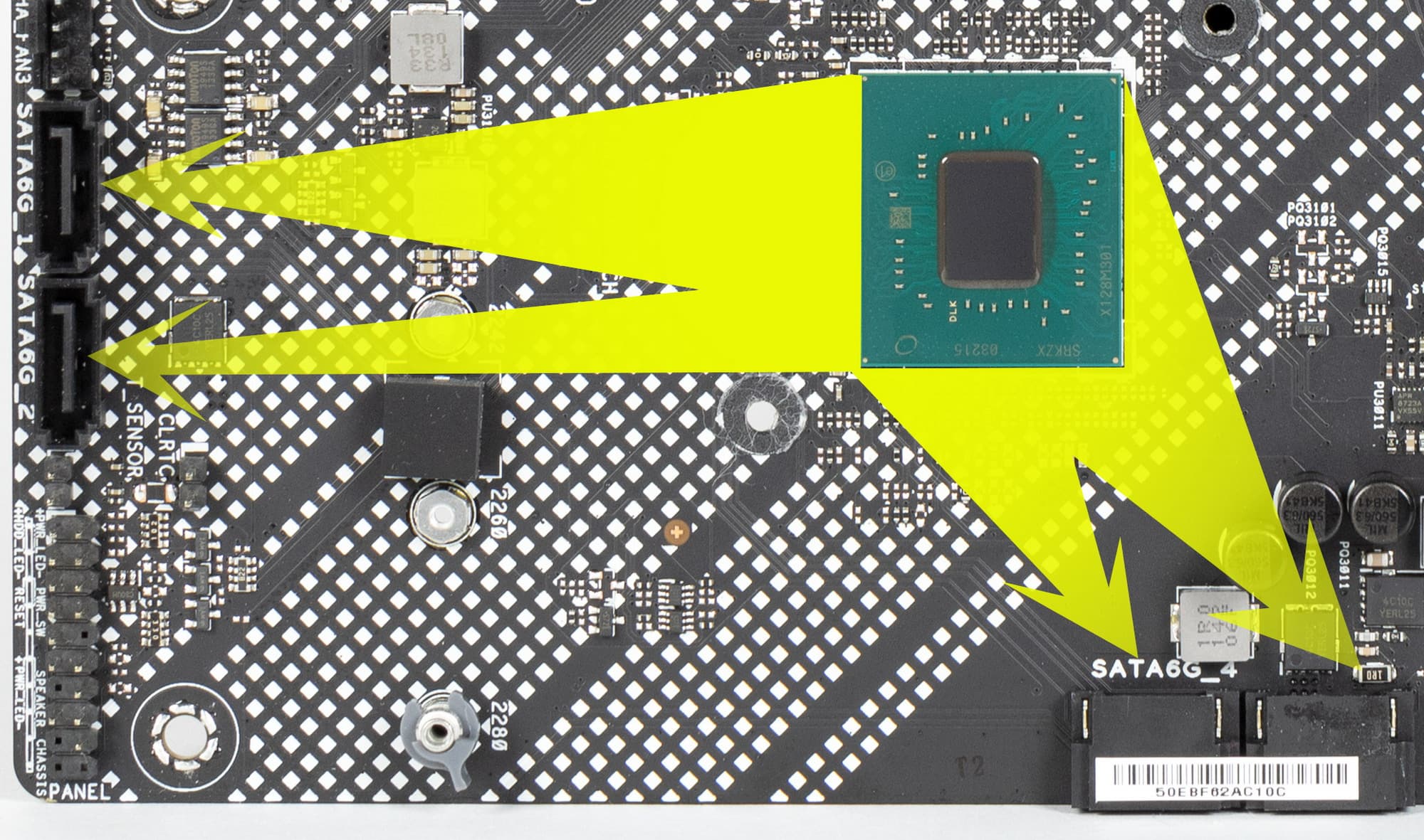 Кроме USB-портов, к которым мы подойдем позже, чипсет B660 обладает 14 PCIe линиями и 4 портами SATA. Считаем, сколько линий уходит на поддержку (связь) с тем или иным элементом (надо учитывать, что 14 линий не единой версии, а 6 линий PCIe 4.0 и 8 линий PCIe 3.0):