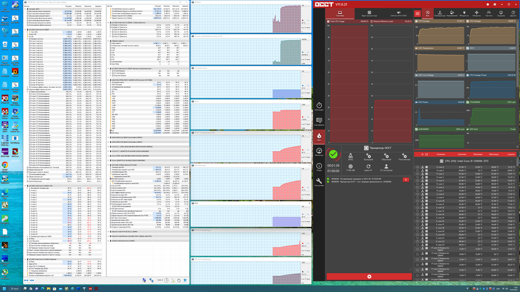 Как мы видим, автоматический разгон даже самого мощного на сегодня 13900К получился приличный: до 5,5/4,3 ГГц. Но при этом даже такая мощная СВО еле справлялась с нагрузкой, работая на максимуме. Причиной тому – завышенный вольтаж на ядре процессора (выше 1.5 В), все же, как показал опыт, выше 1,35 – 1,4 В поднимать не стоит, многие СВО перестанут справляться с нагревом 13900К на очень высоких частотах.